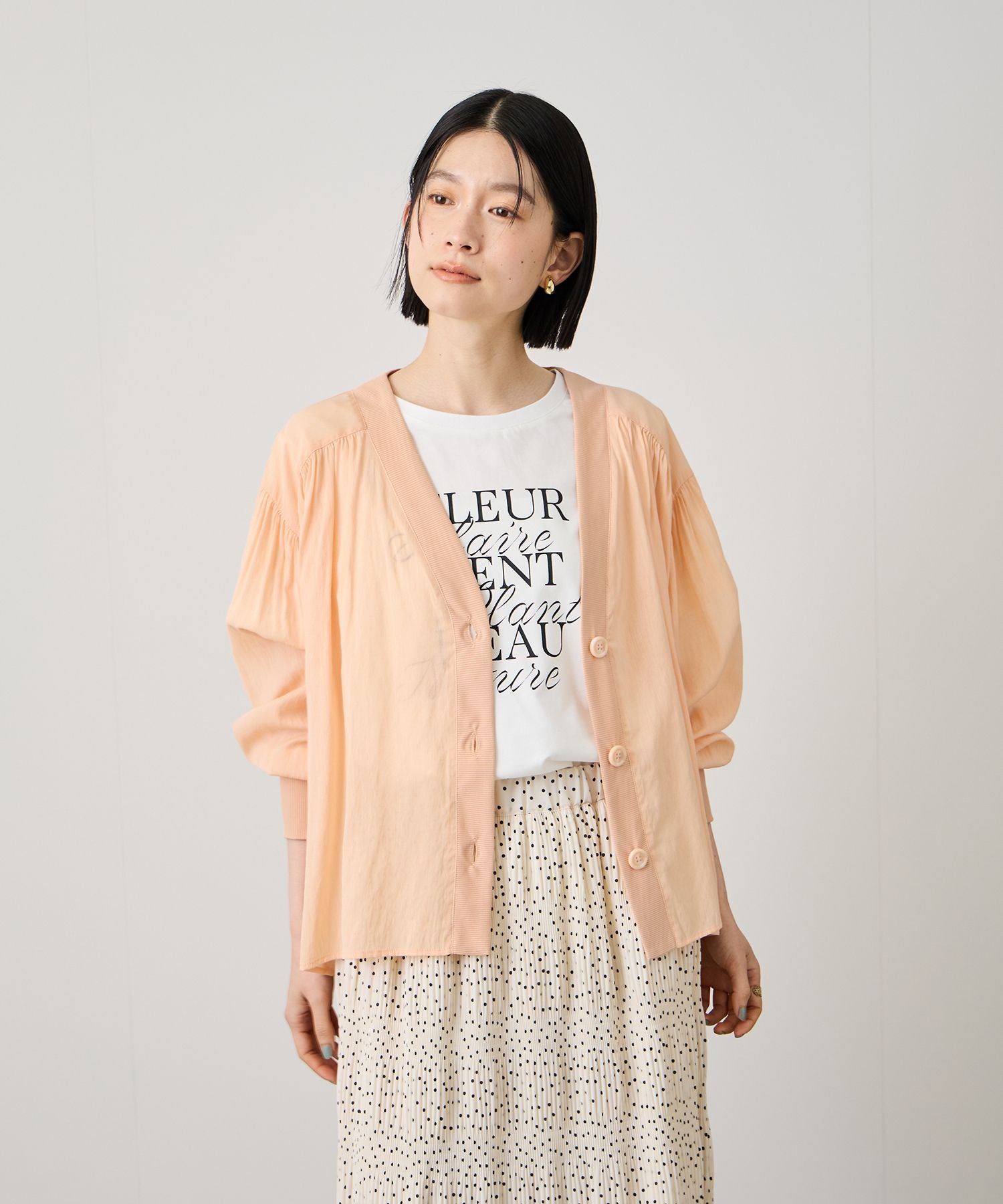 Vネックのラインがお顔周りをスッキリと見せ、前を閉じればブラウスのようにも着られる万能さが魅力です。