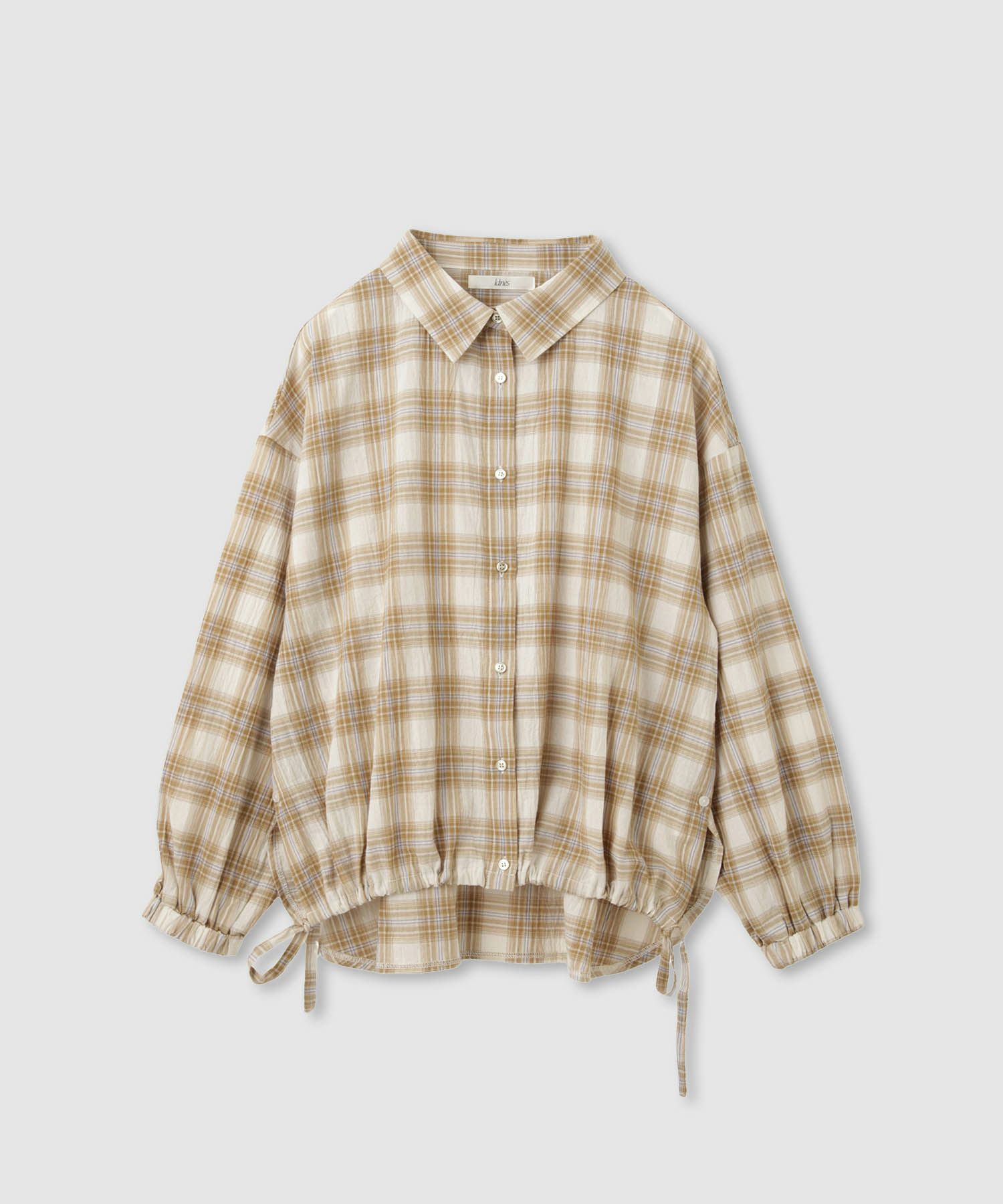 イドネス 長袖シャツ 綿100% コットン 裾ドローコード サイドスリット シアー 透け感 チェック柄 チェックシャツ