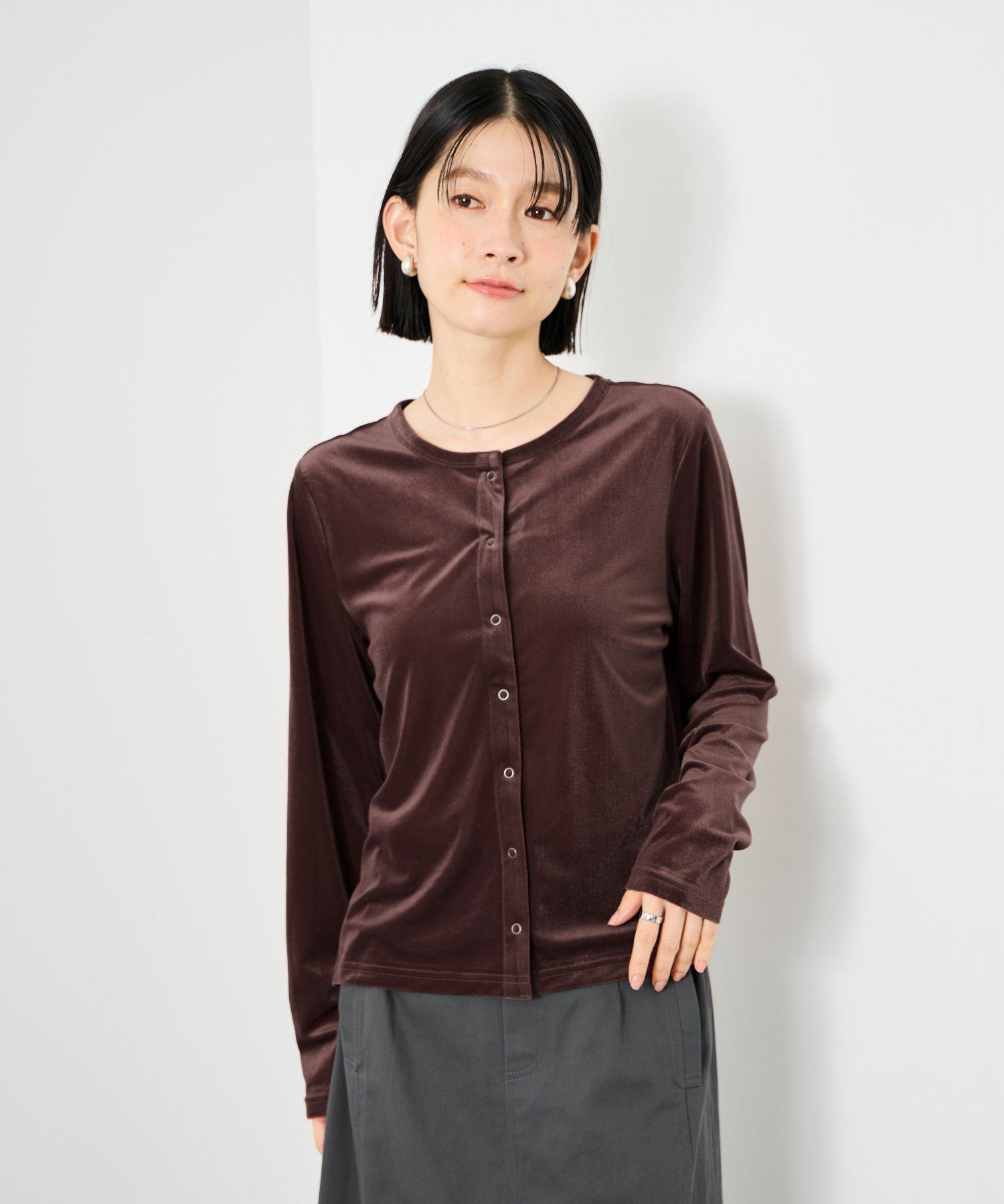 程よく光沢感のあるベロア素材が上品な印象で、柔らかい素材感で肌なじみの良い一枚です。