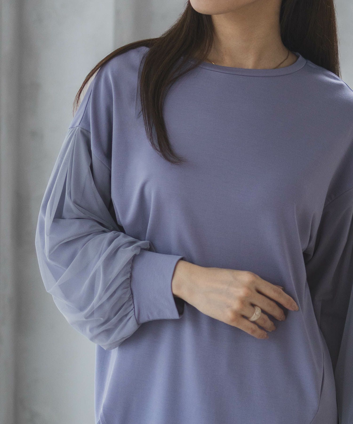 ちょうど良いチュニック丈の袖チュール切替プルオーバー。