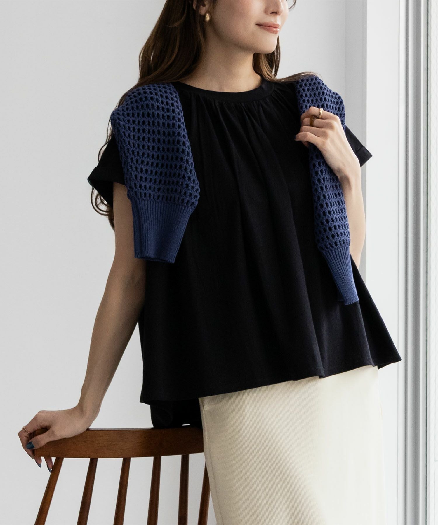 首から胸にかけて入るギャザーがゆったりと着心地の良いデザイン。