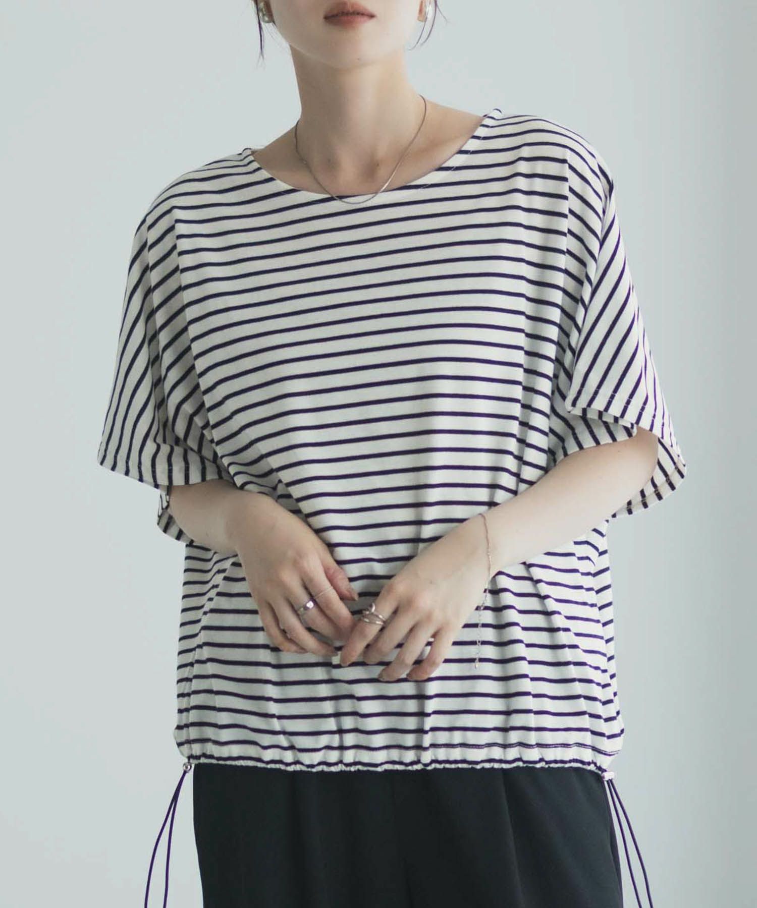 イドネス 半袖Tシャツ 綿混 裾ドロスト ボーダー 白 カットソー