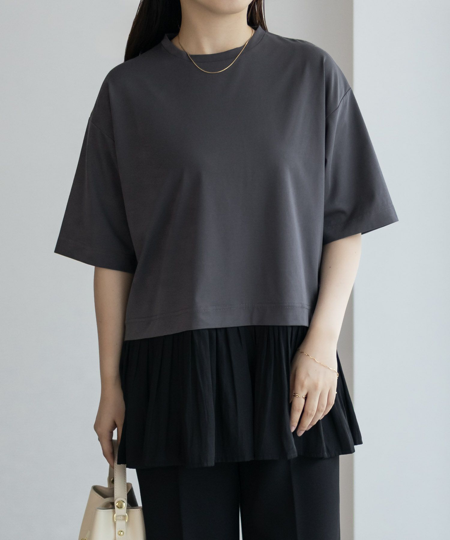 カットソー部分は、裏面にポリエステル、表面にコットンをプレーティングしたきれいめ天竺。