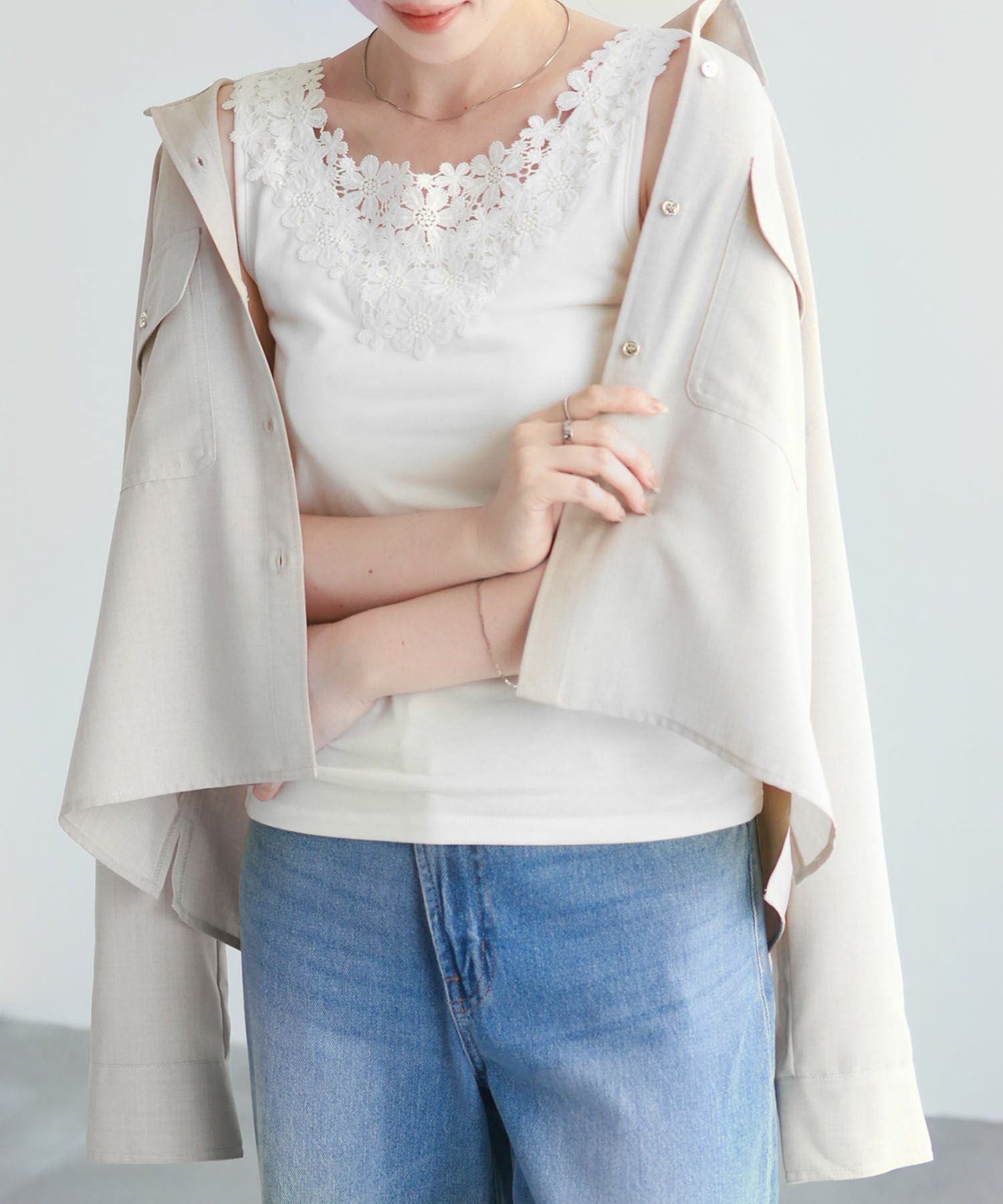シャツやニットと合わせれば肩や背中部分からチラ見せできるレースがスタイリングの名脇役に!