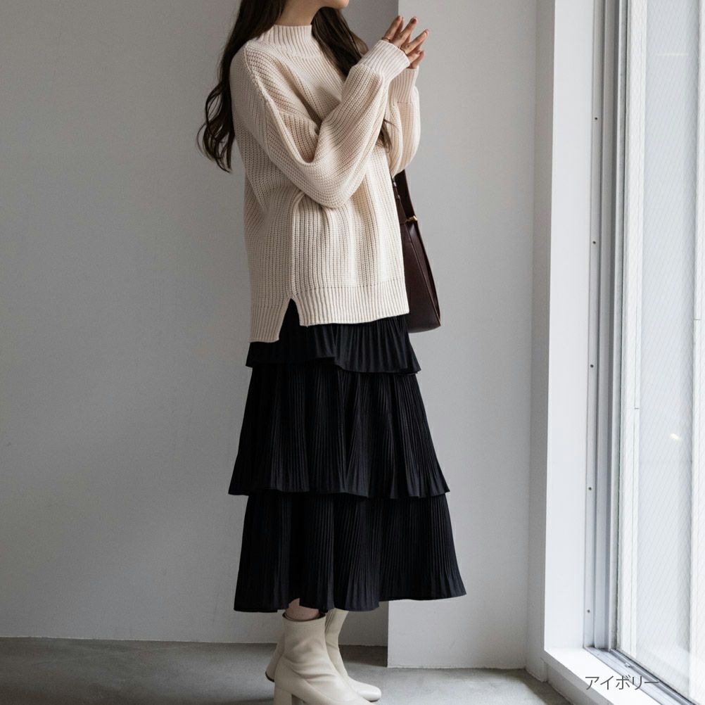 ネイビー ニット セーター 静電気抑制 静電気対策 ウォッシャブルニット 洗えるニット 畦編み サイドスリット モックネック ハイネック