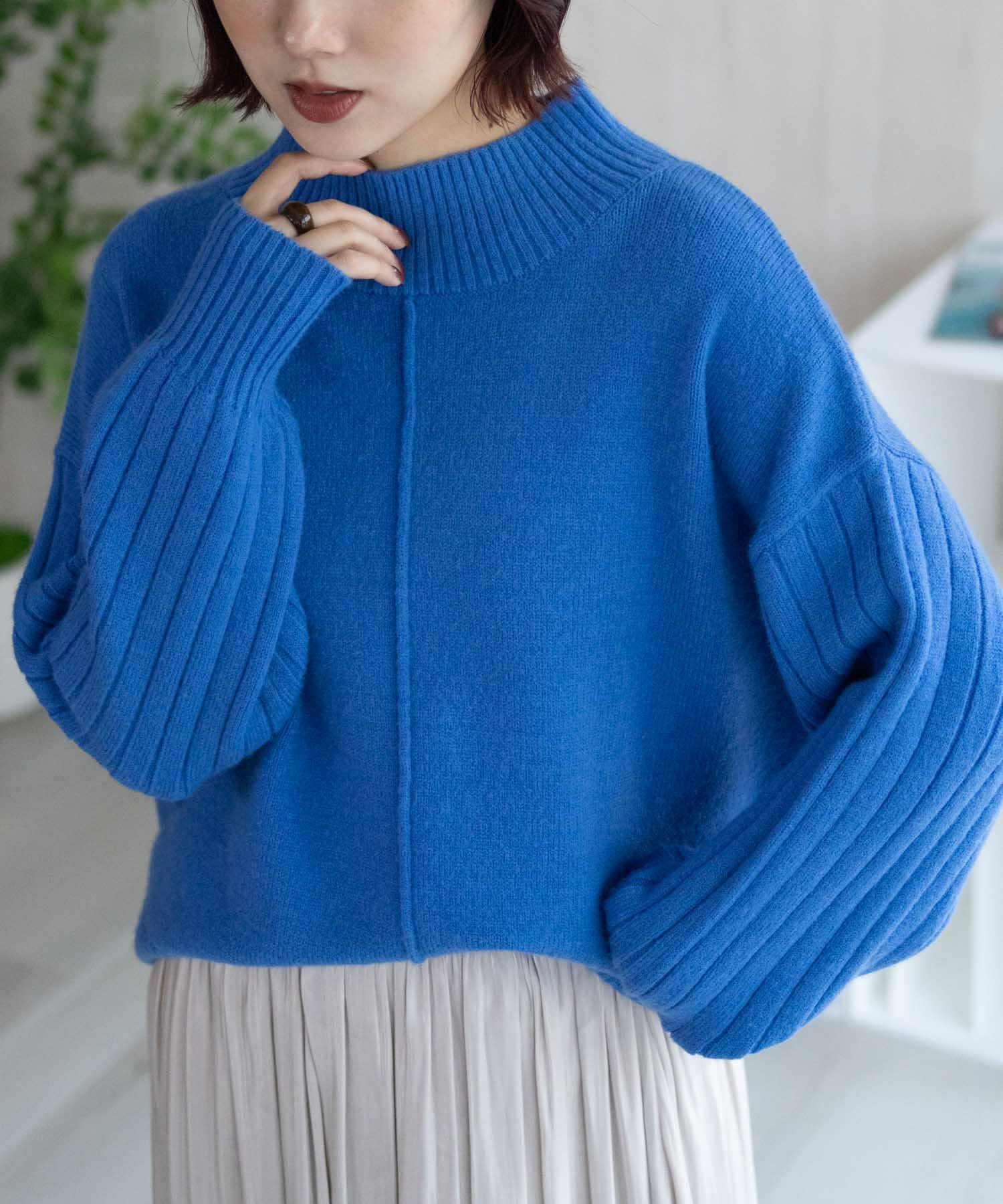 ネイビー ニット セーター ロング丈 リブ編み ハイネック プルオーバー