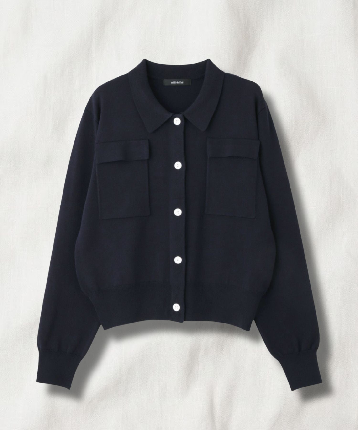 ミリデラール ニット カーディガン ポロカーデ 襟付き ポケット 白 黒 長袖 ライトアウター