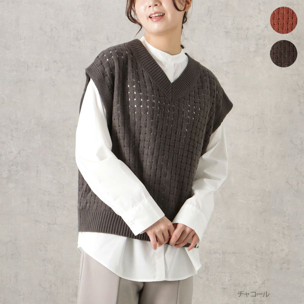 「NAVY」から、バスケット編みのベストと、バンドカラーの