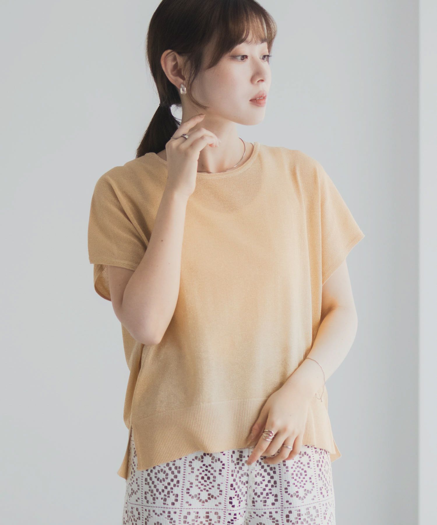 肩にかかる絶妙な長さのフレンチ袖にトレンドのラメデザインが映えるサマーニットトップス。