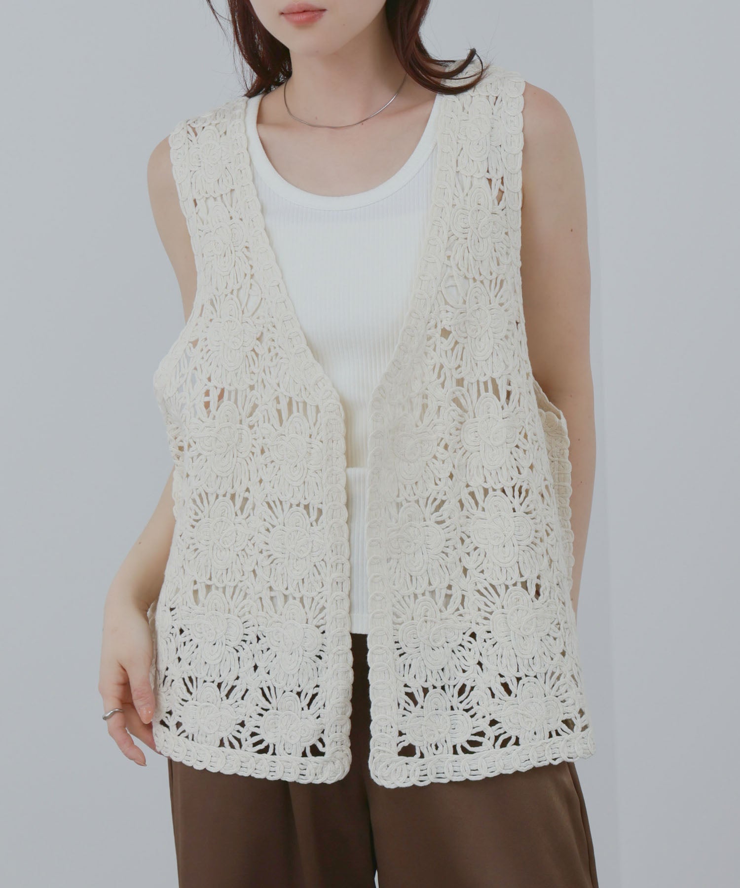 全面に配置された花柄モチーフが存在感たっぷりなクロシェベスト。