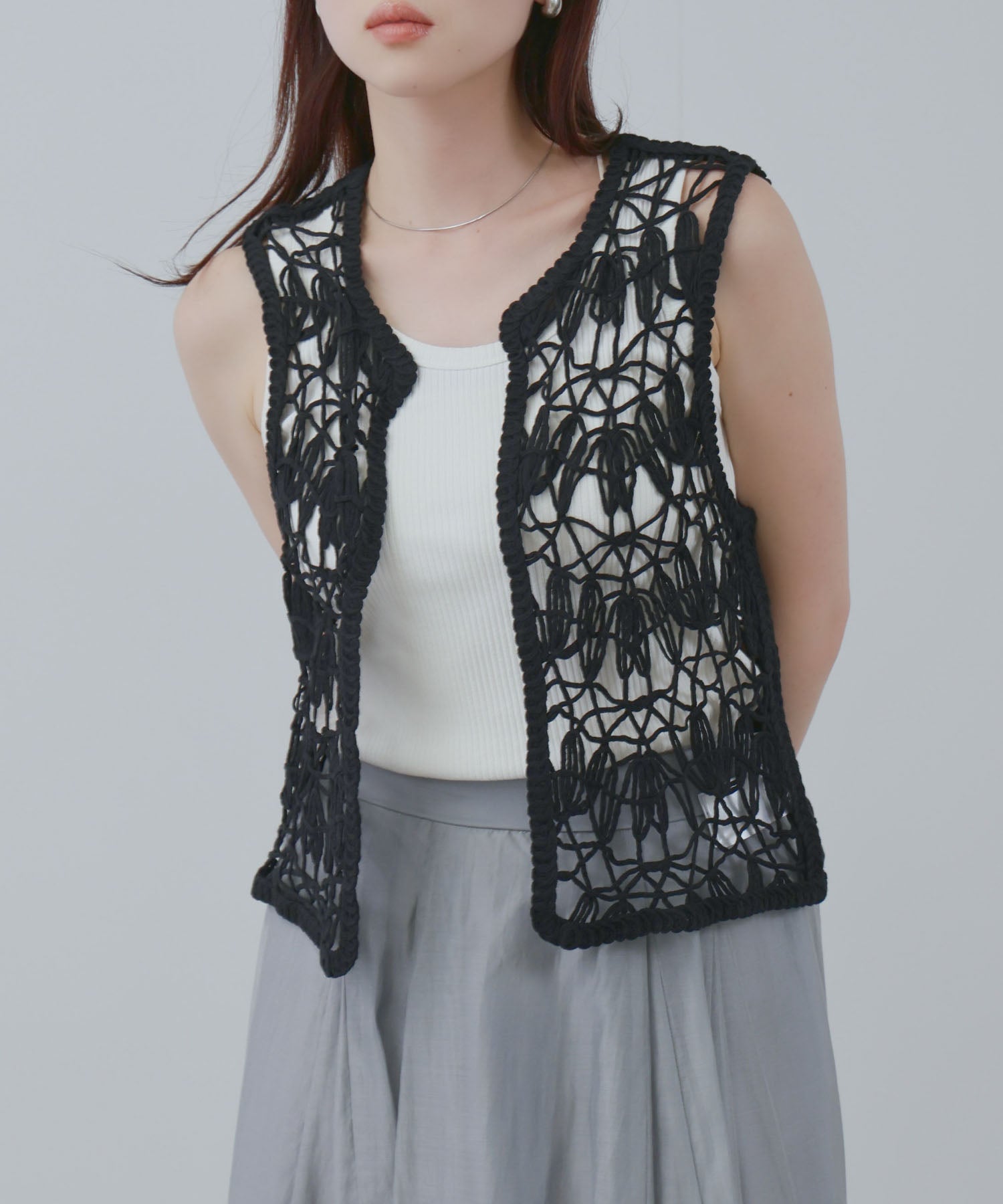 シンプルなトップスにプラスするだけで、グッとこなれ感が出るクロシェ編みベスト。