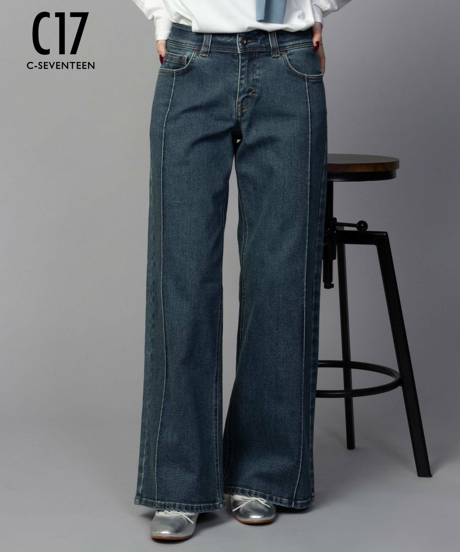 シーセブンティーン デニムパンツ ジーンズ ジーパン バギーパンツ ワイドパンツ ピンタック ストレッチ 前開き フロントジップ ポケット ロングパンツ