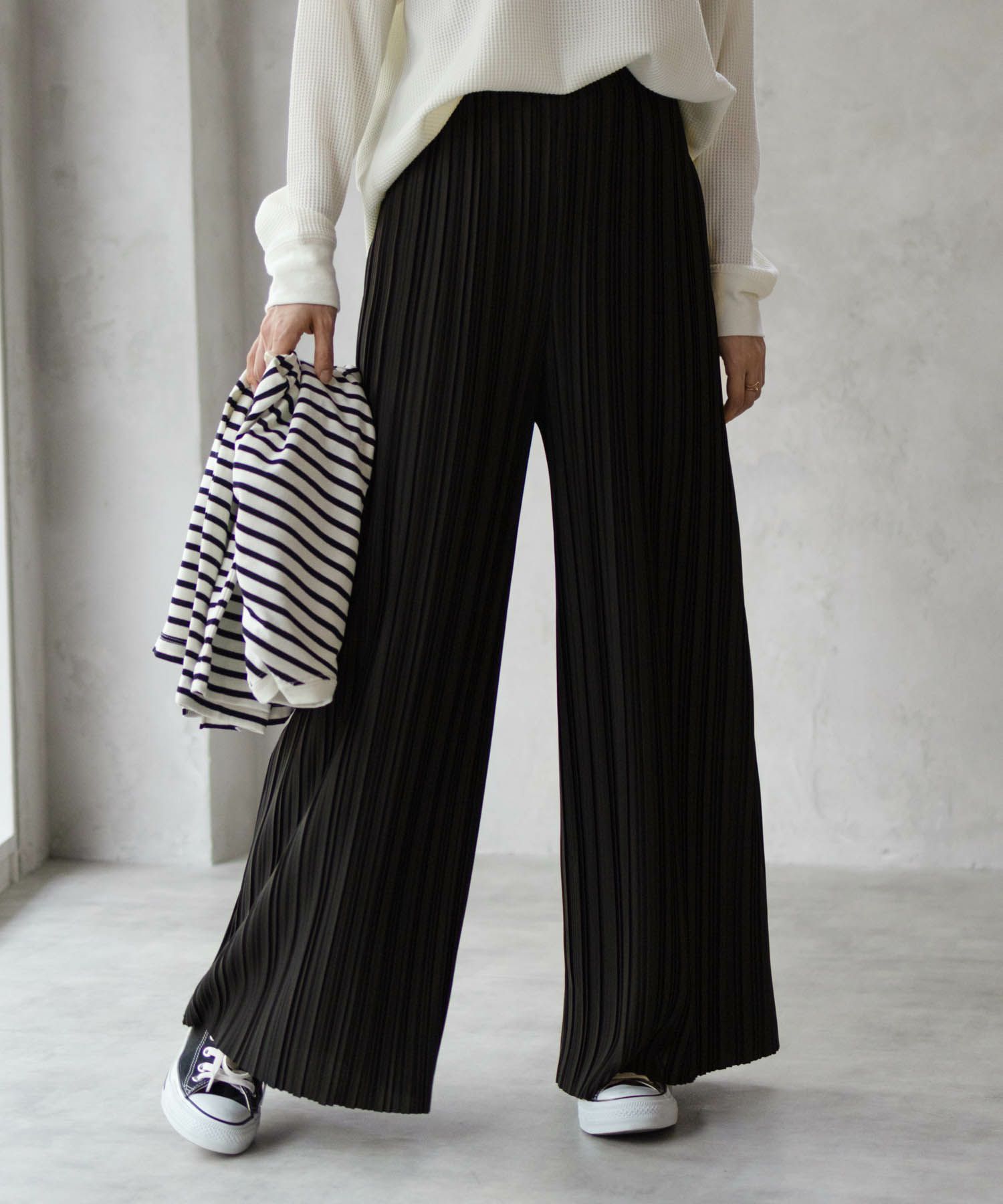 伸縮性のある素材にプリーツ加工を施した、ワイドシルエットのイージーパンツ。