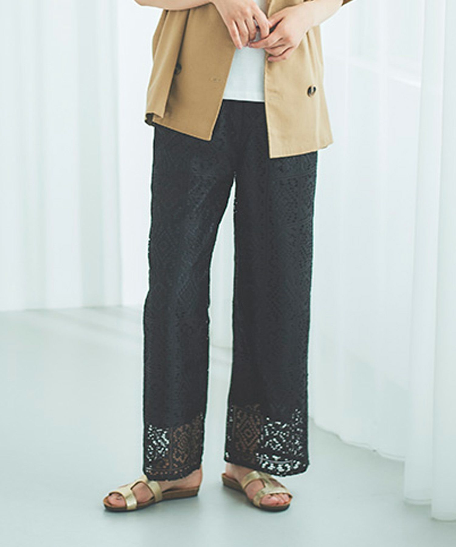 ブロックレースの透け感が特徴的なクロシエ編みモチーフの総レースパンツ。