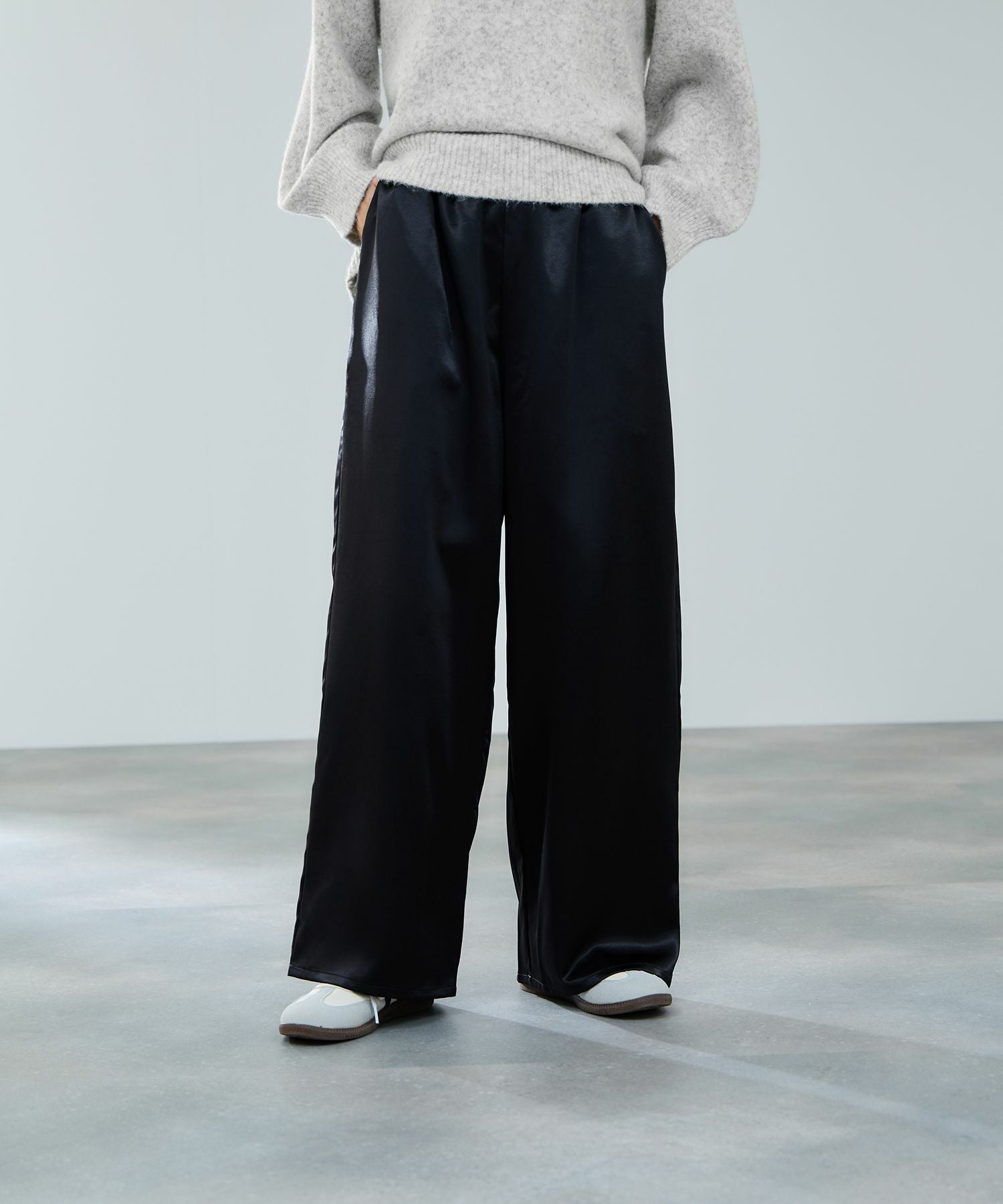 今季注目の“艶感”を手軽に取り入れられる、サテン素材のワイドパンツ。