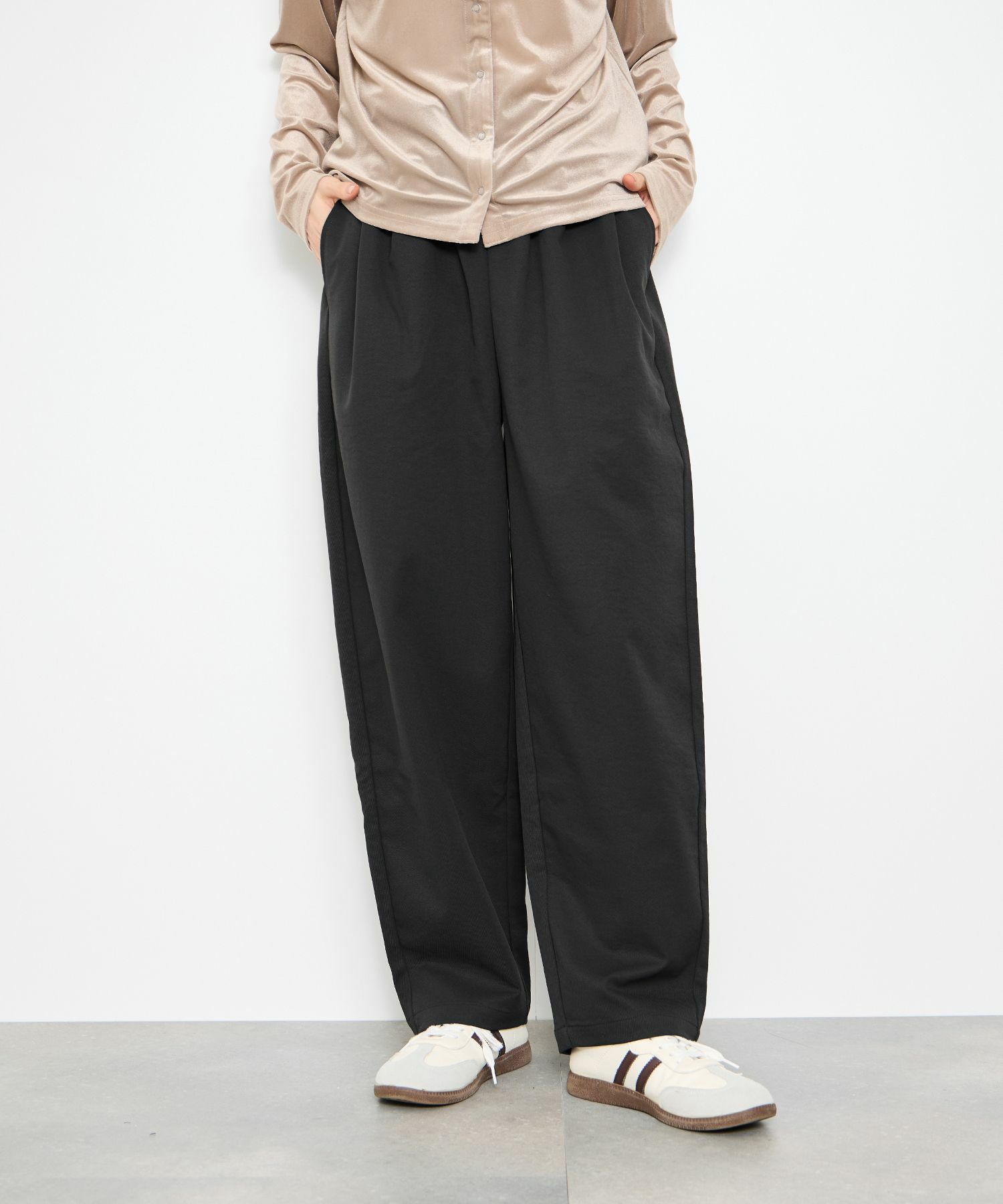 ウエストのドロストデザインがポイントのテーパードパンツ。