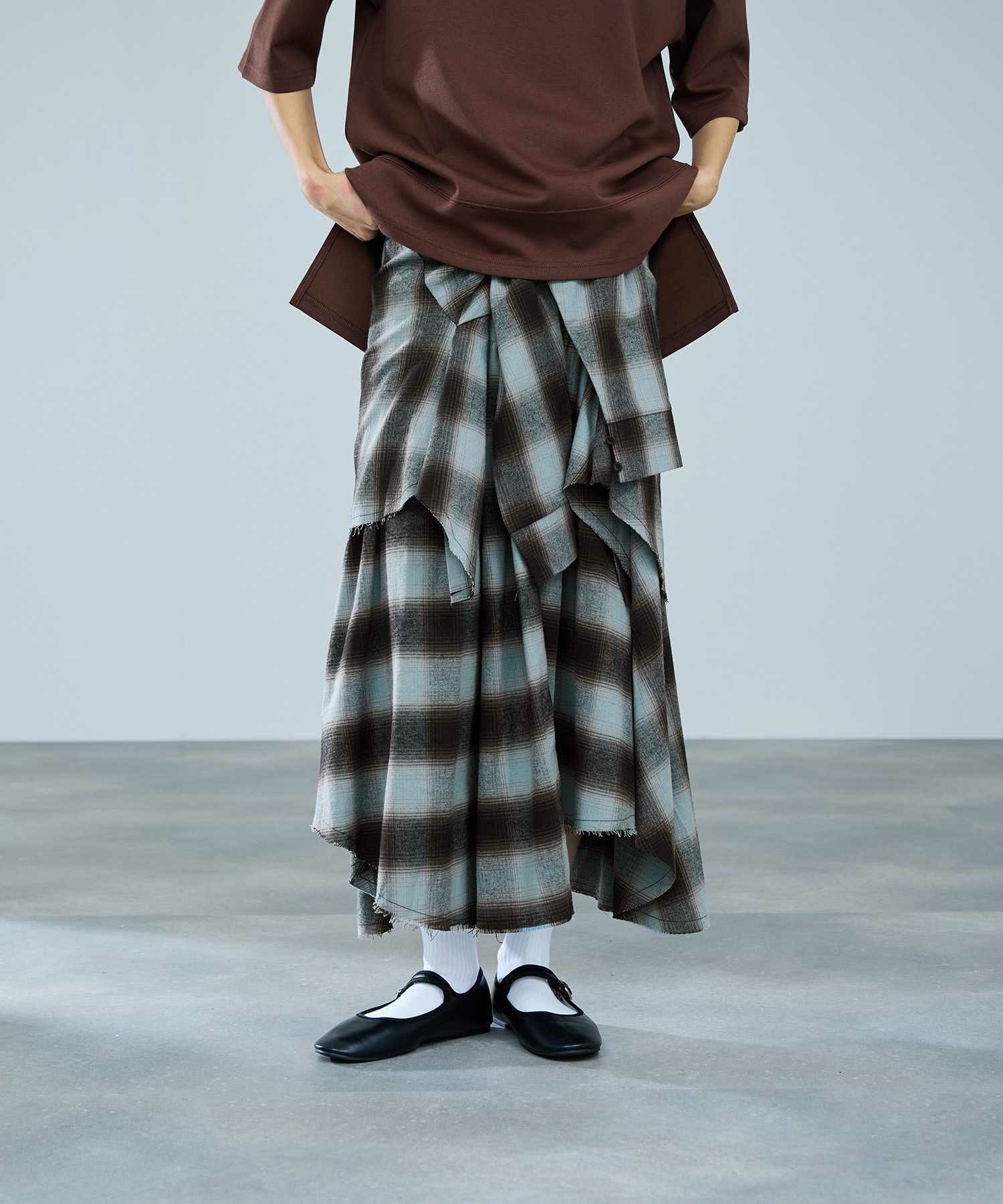 ミリデラール フレアスカート アシンメトリー フェイクスリーブ オンブレチェック 黒 ロングスカート