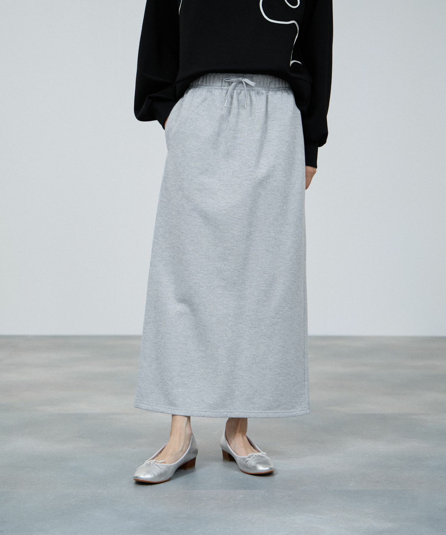 ミリデラール Iラインスカート ナロースカート 裏毛 バックスリット ウエストゴム 紐 ポケット ラメ 黒 ロングスカート