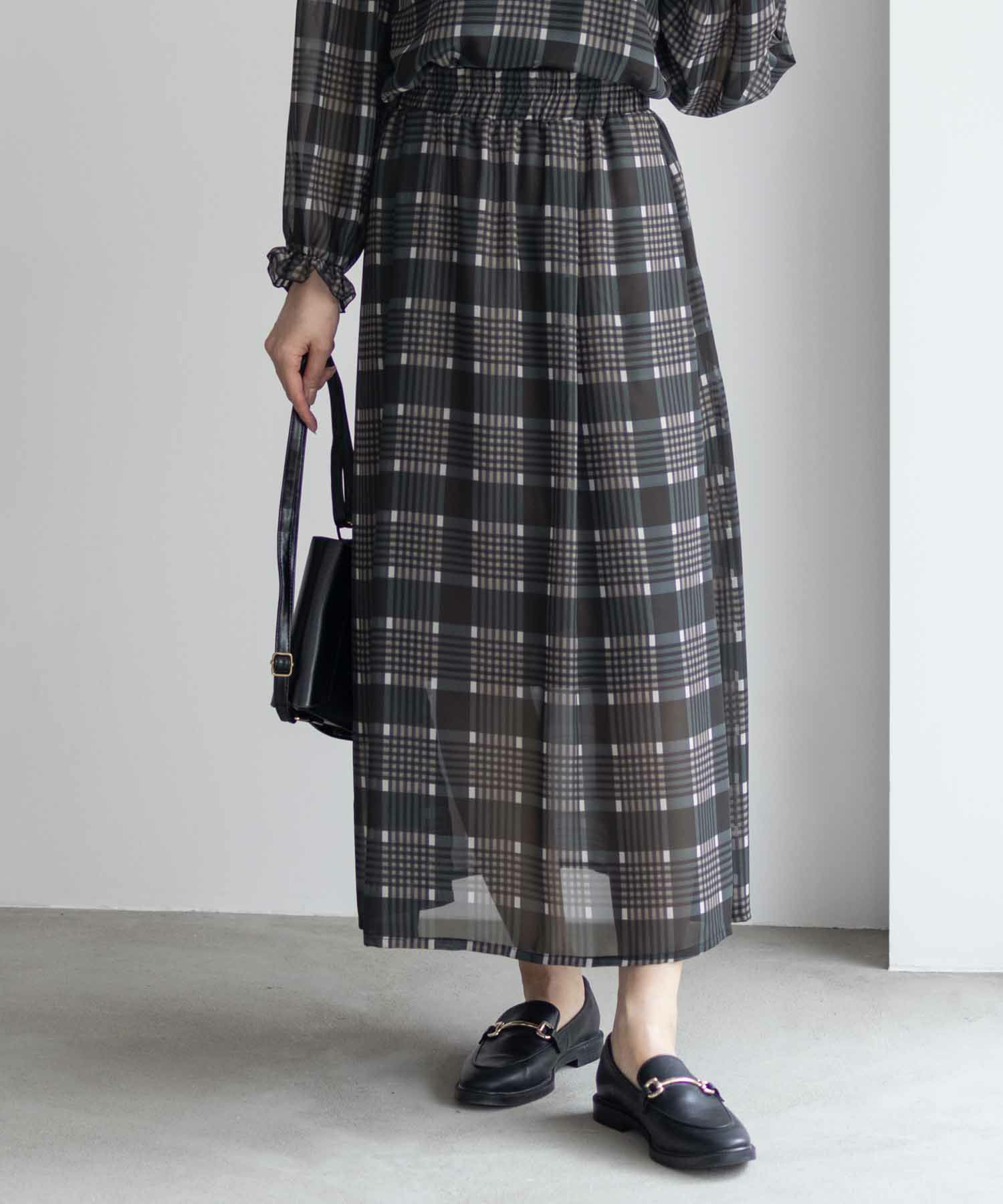 ハッシュアッシュ フレアスカート シフォンスカート ポケット 裏地付き タック タータンチェック チェック柄 透け感 ミディアム丈 ミモレ丈 ロングスカート