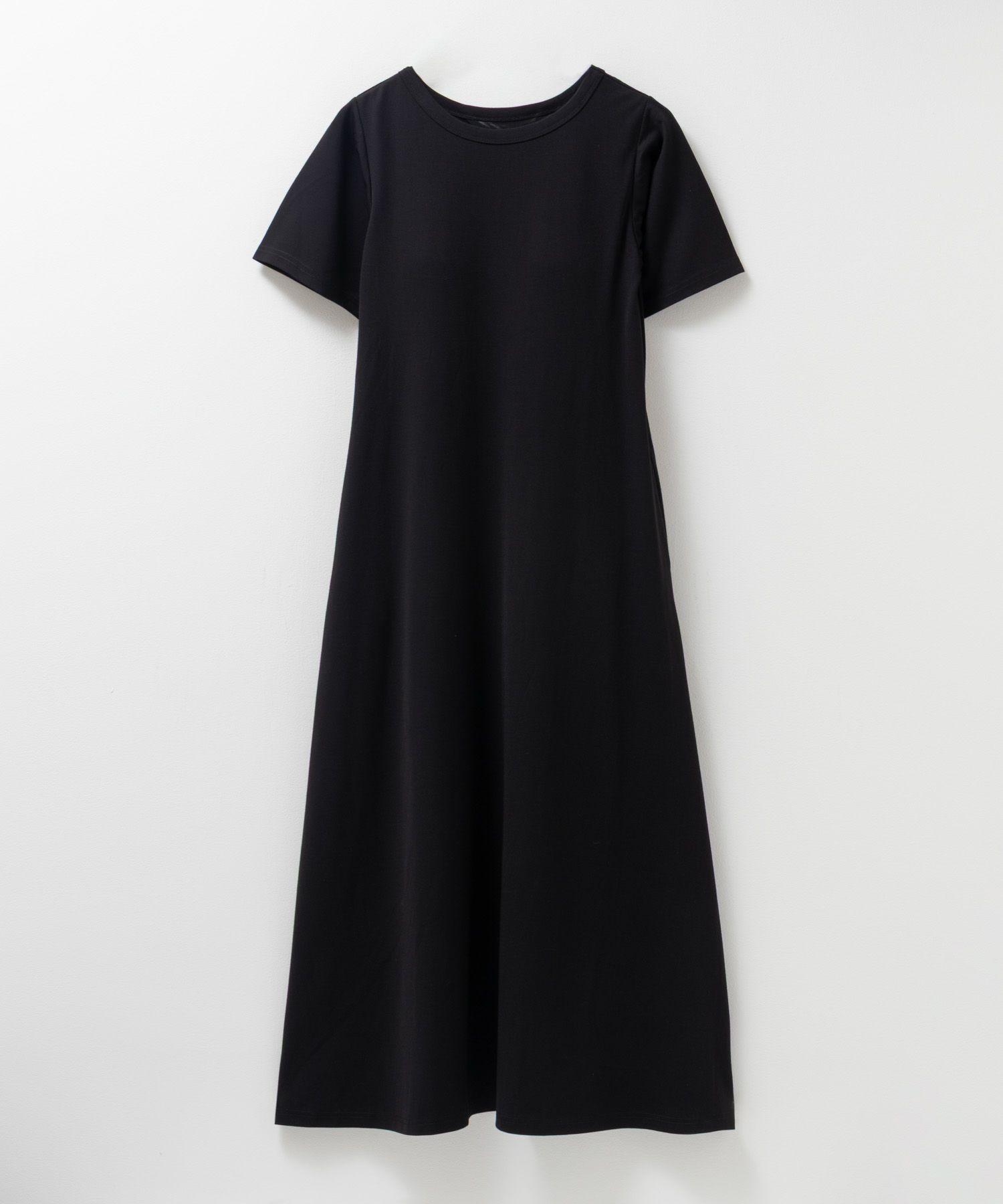 ミリデラール ワンピース カップ付き 半袖 カップ取り外し可能 ストレッチ ポケット 無地 黒 フレアワンピース ロング丈