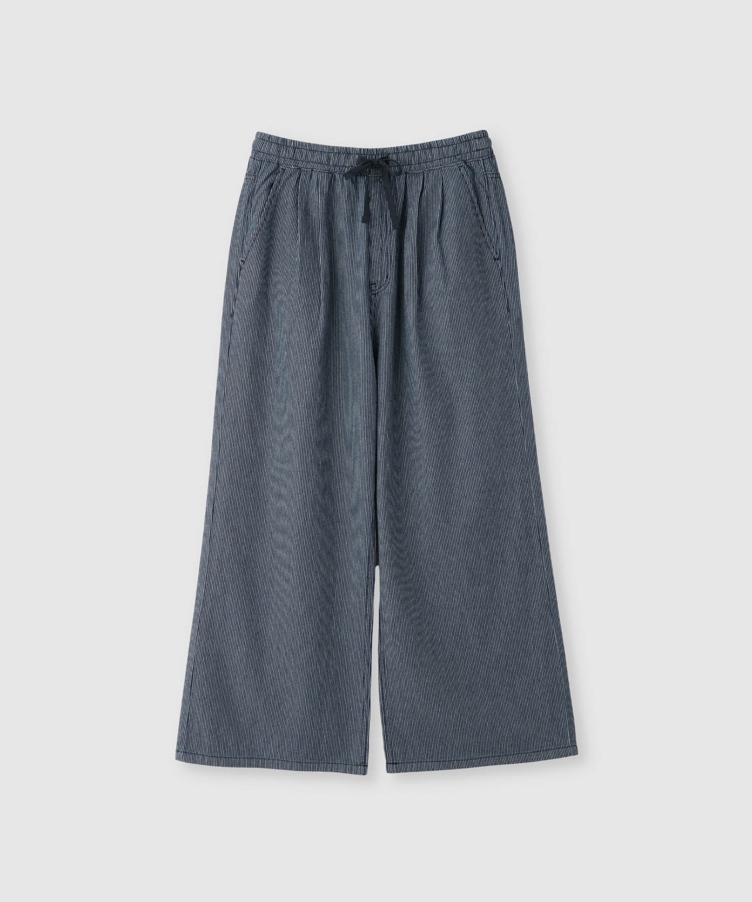 ネイビー デニムパンツ ワイドパンツ シャンブレー生地 ライトオンス ダブルタック ウエストゴム 紐 ポケット ジーンズ ジーパン ロングパンツ