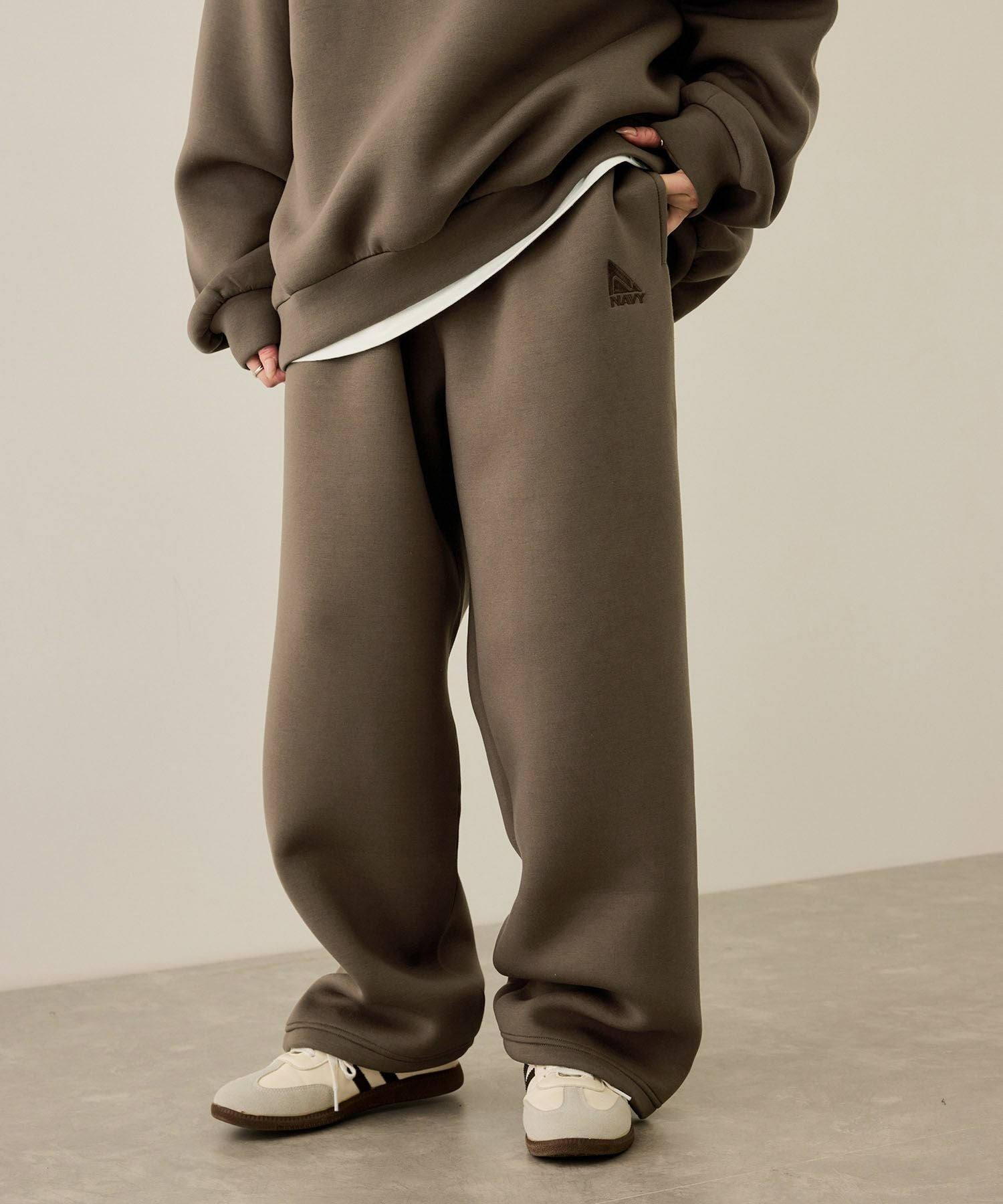 ネイビー ワイドパンツ ポンチ素材 ウエストゴム 裾ドローコード ロゴ 刺繍 黒 ロングパンツ