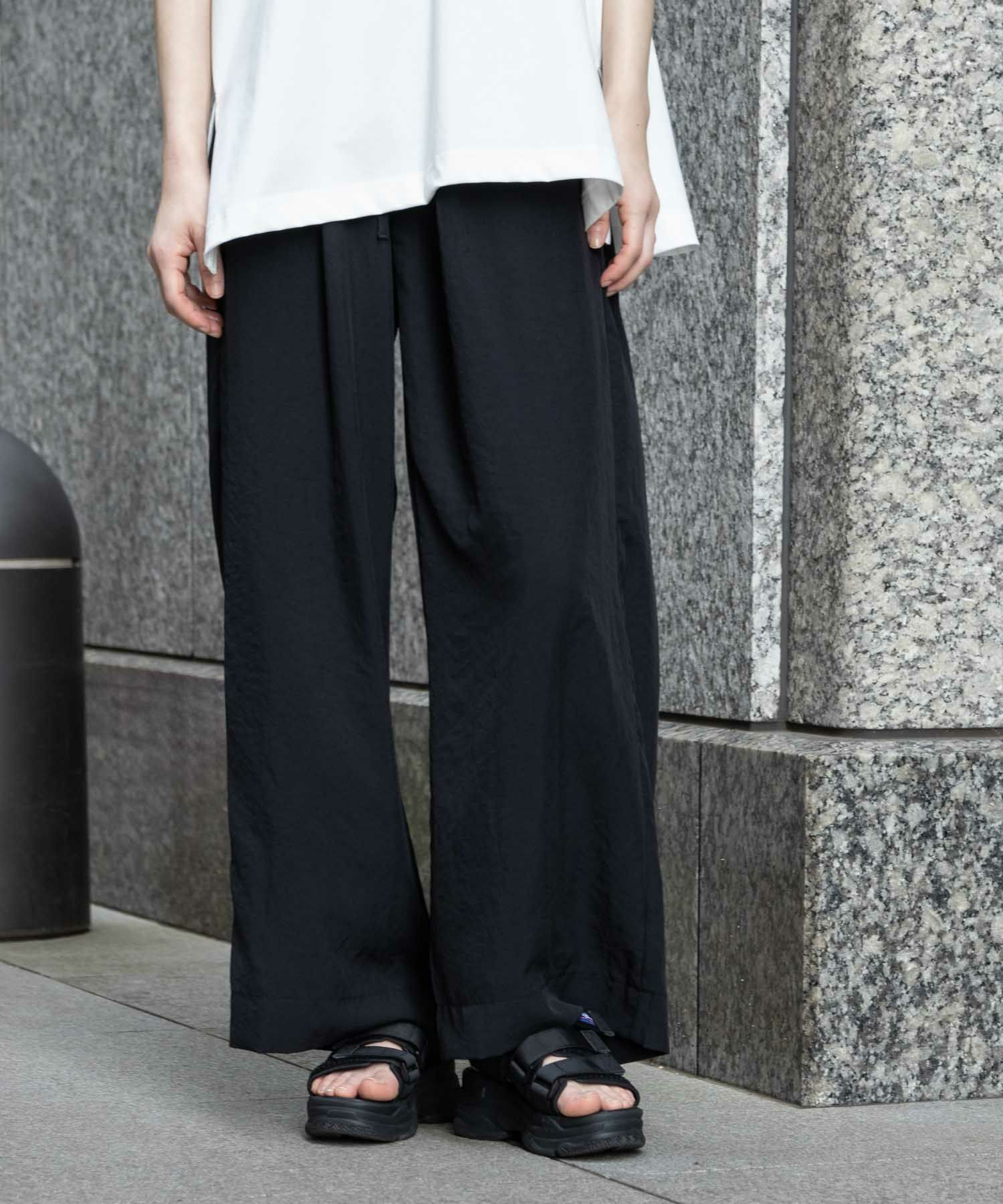 太めのウエストベルトが腰回りをすっきり見せてくれるイージーパンツ。