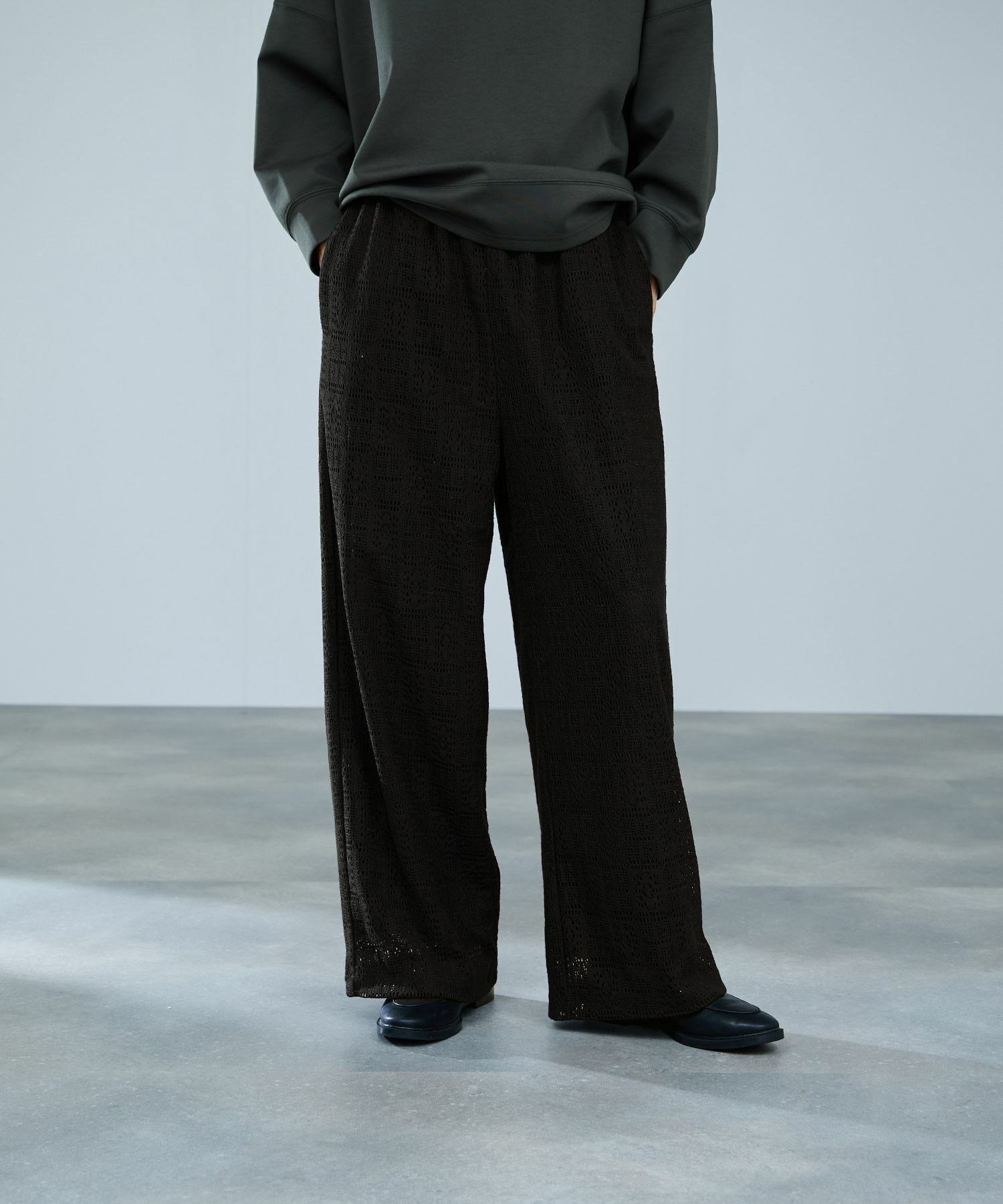 ミリデラール クロシェパンツ レースパンツ パネル柄 透け感 裏地付き ウエストゴム ポケット 黒 白 ロングパンツ