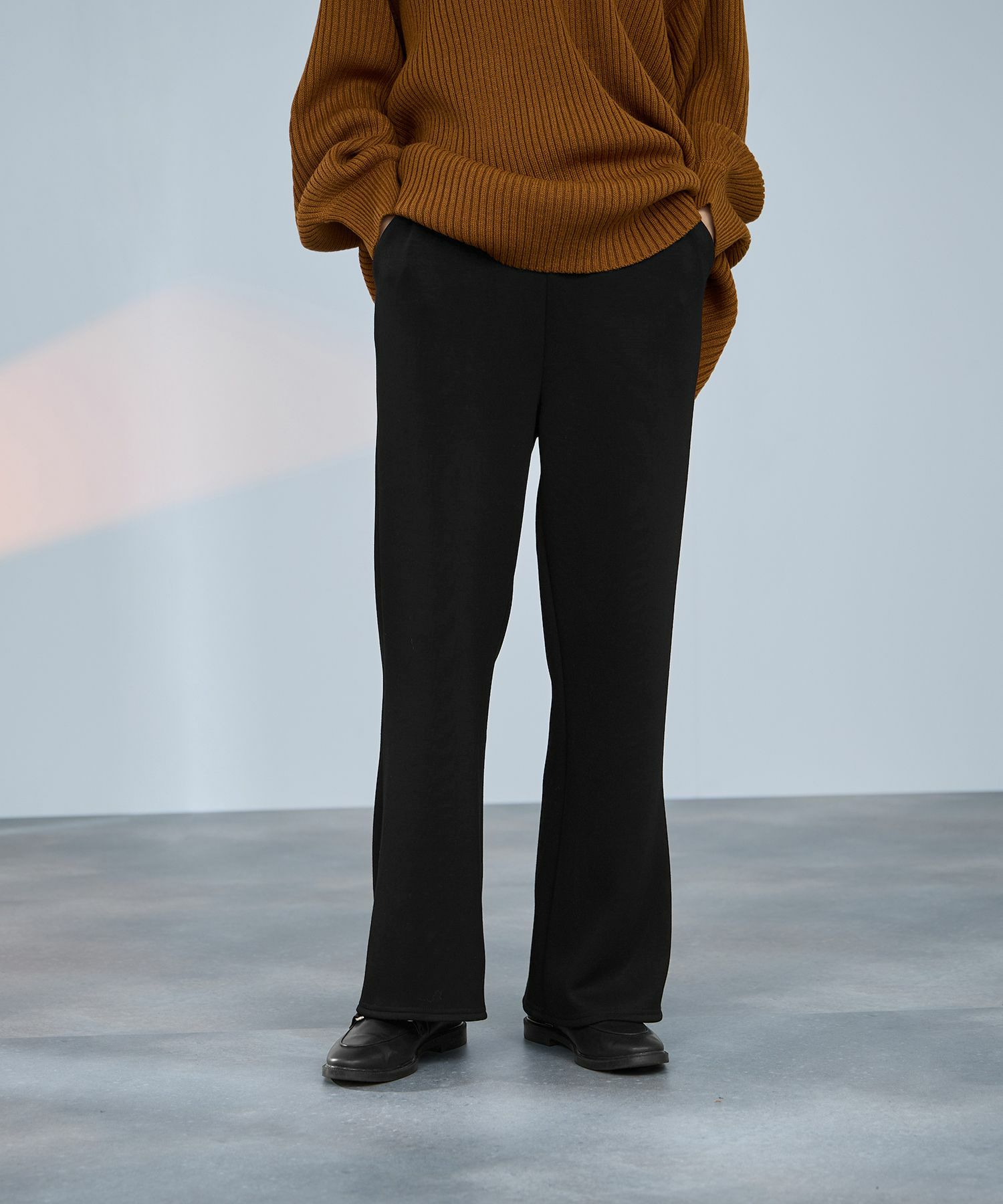 暖かくてやわらかな裏フリースダンボール素材を使用した、セミフレアシルエットのパンツ。