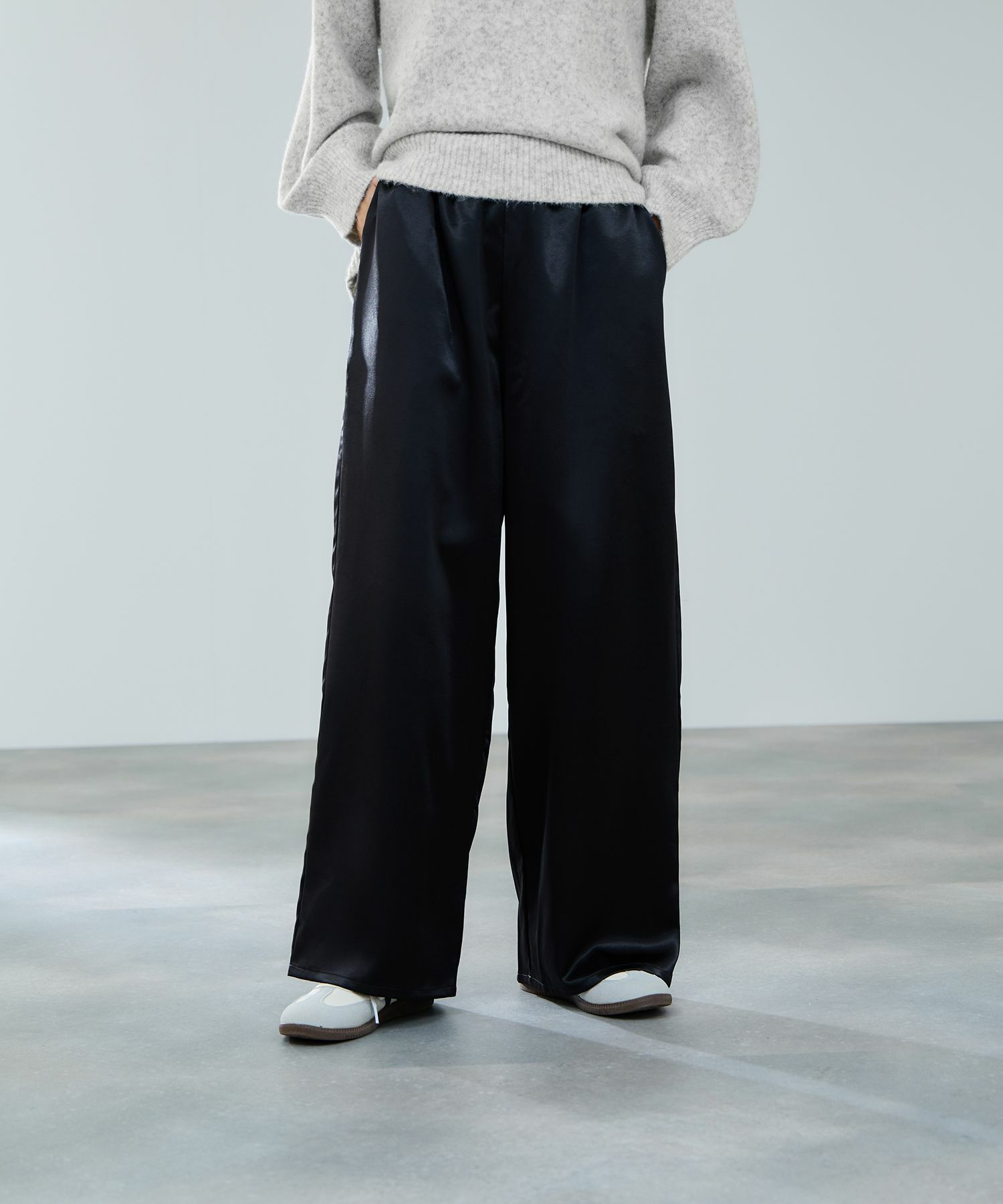 今季注目の“艶感”を手軽に取り入れられる、サテン素材のワイドパンツ。
