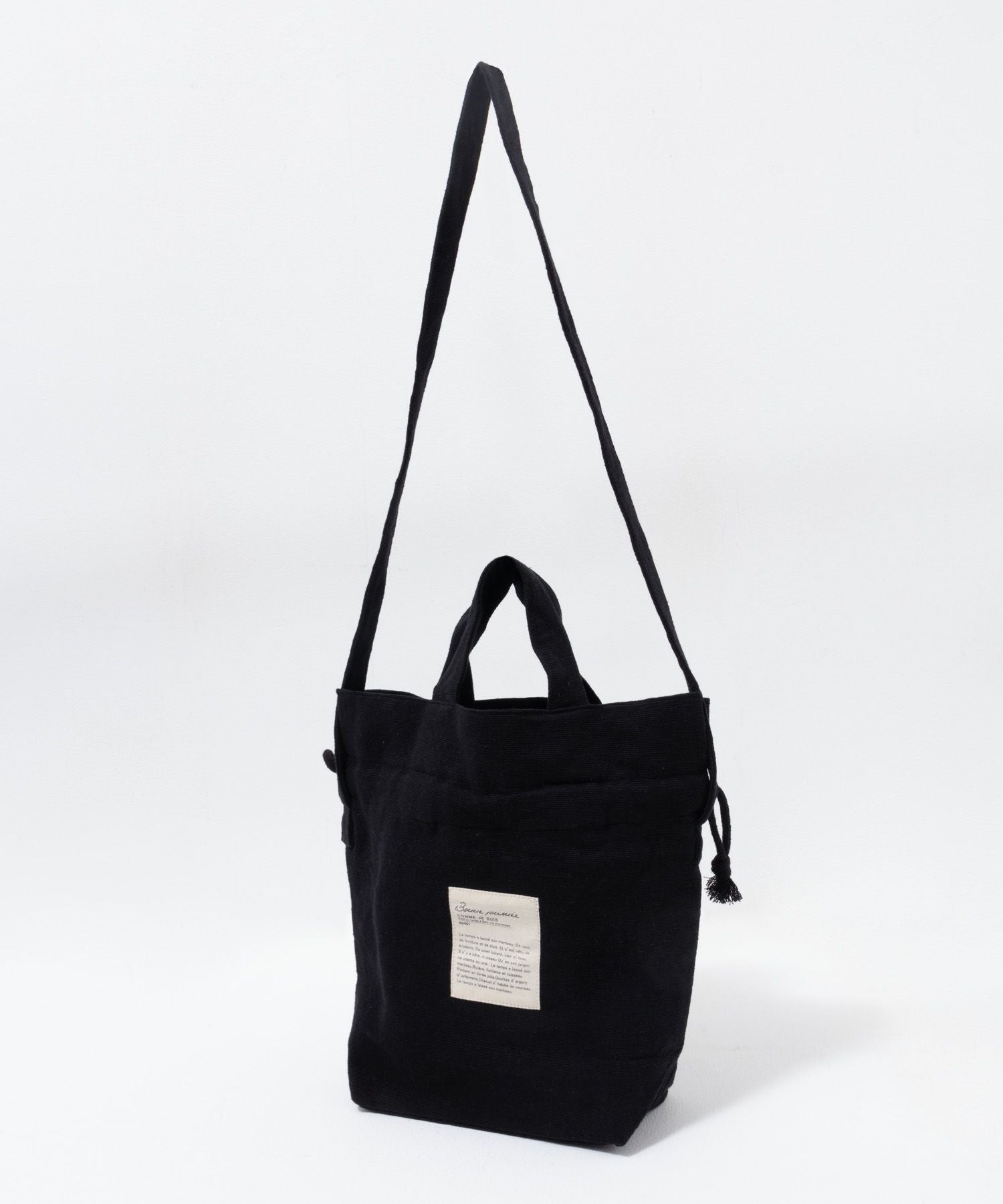 ショルダーバッグ 巾着 2WAY 綿100% コットン 内ポケット 外ポケット ワッペン 黒 鞄 バッグ かばん