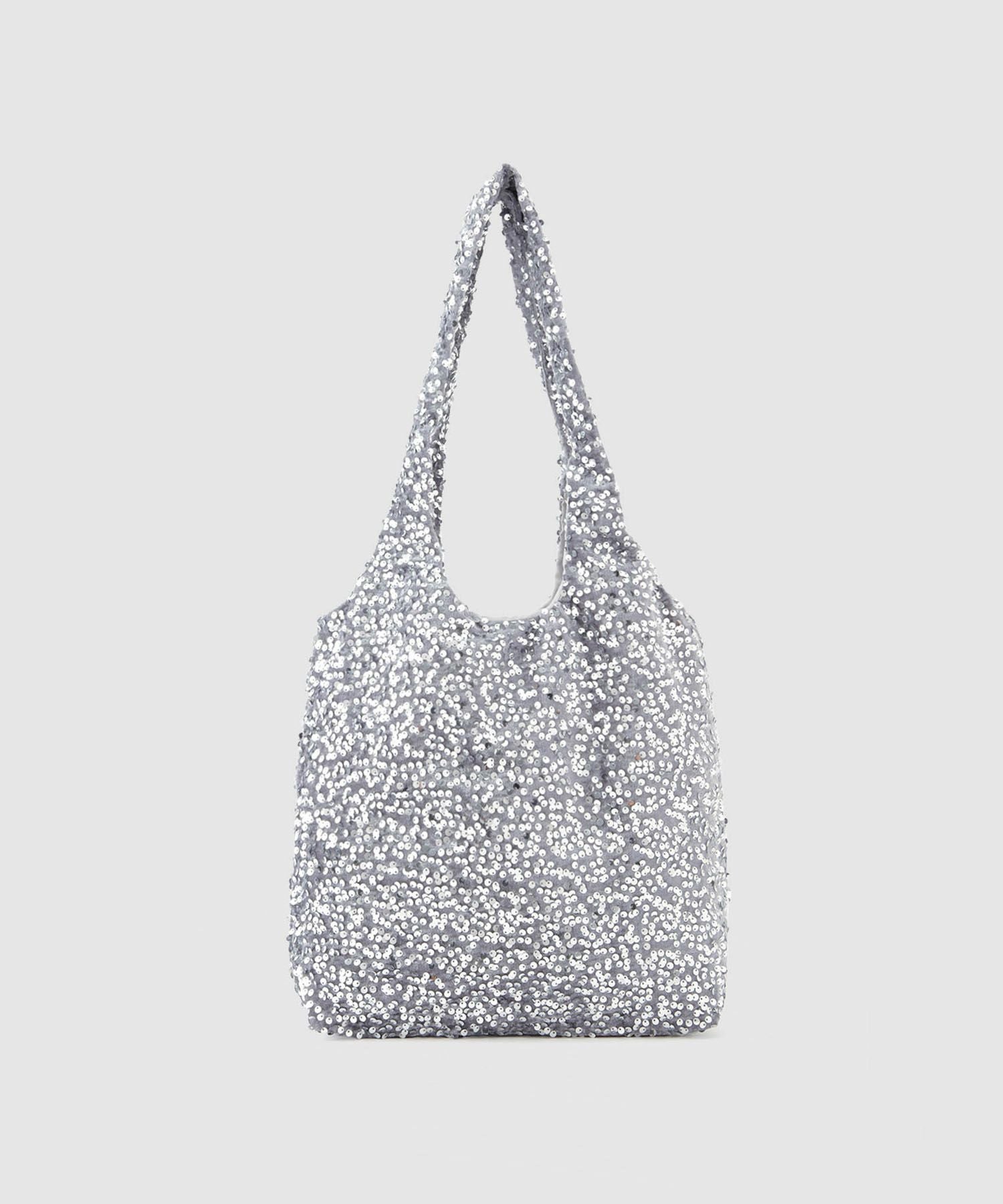 柔かく起毛感のある素材に印象的なスパンコールをたっぷりと取り付けたバッグ。