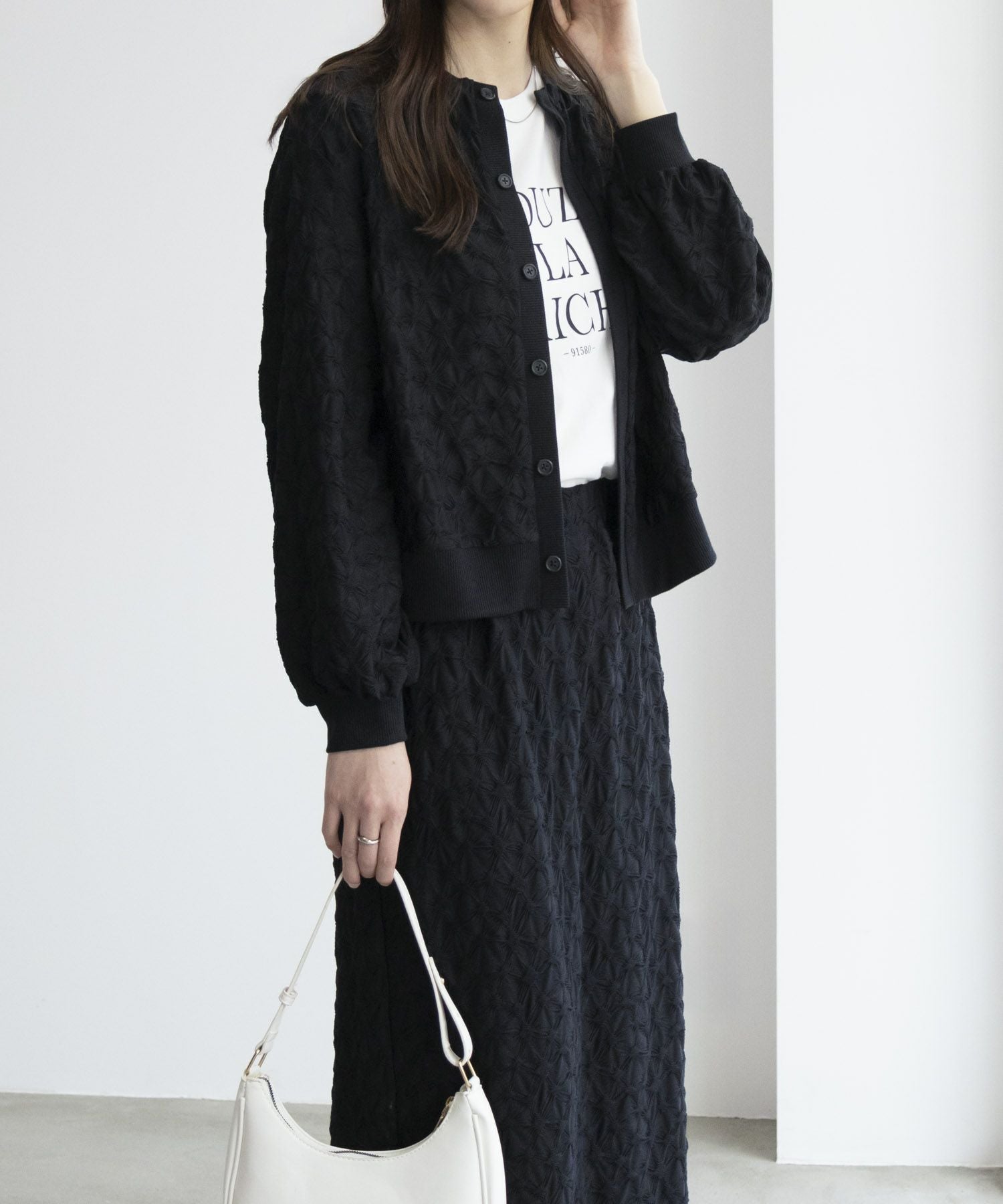 凹凸感が特長的なふくれジャガードを使用したカーディガン。