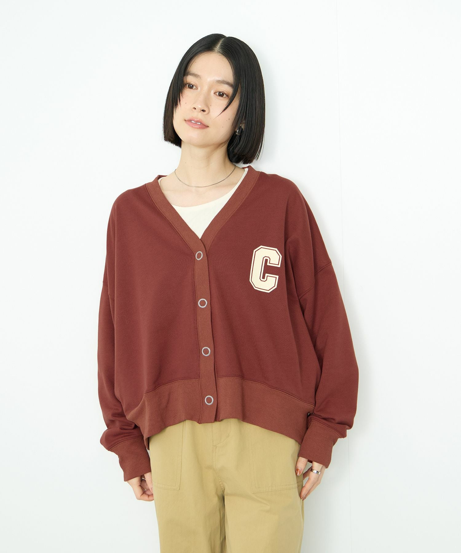 ゆったり落ち感のあるシルエットに、胸元のロゴがさりげないアクセントになるスウェットカーディガン。