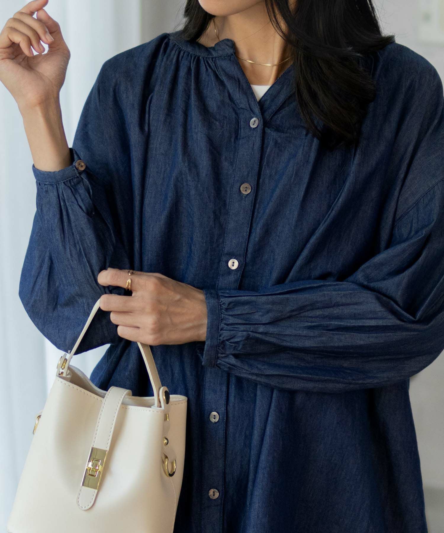 ハウディーマリー 長袖 チュニック シャツ ブラウス 綿100% コットン デニム ギャザー キーネックシャツ カジュアルシャツ