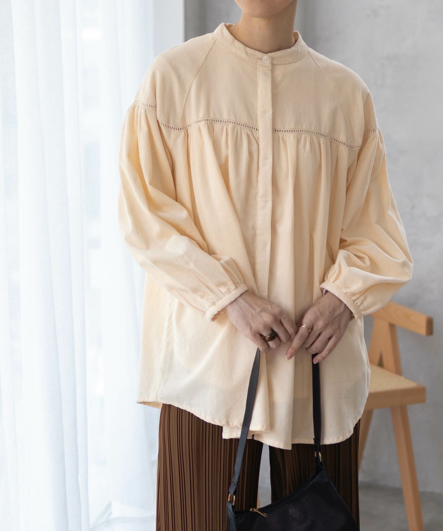 ハウディーマリー 長袖シャツ ブラウス 長袖 コーデュロイ ギャザー フレア ぽわん ボリューム 袖 バルーン バンドカラー カジュアルシャツ