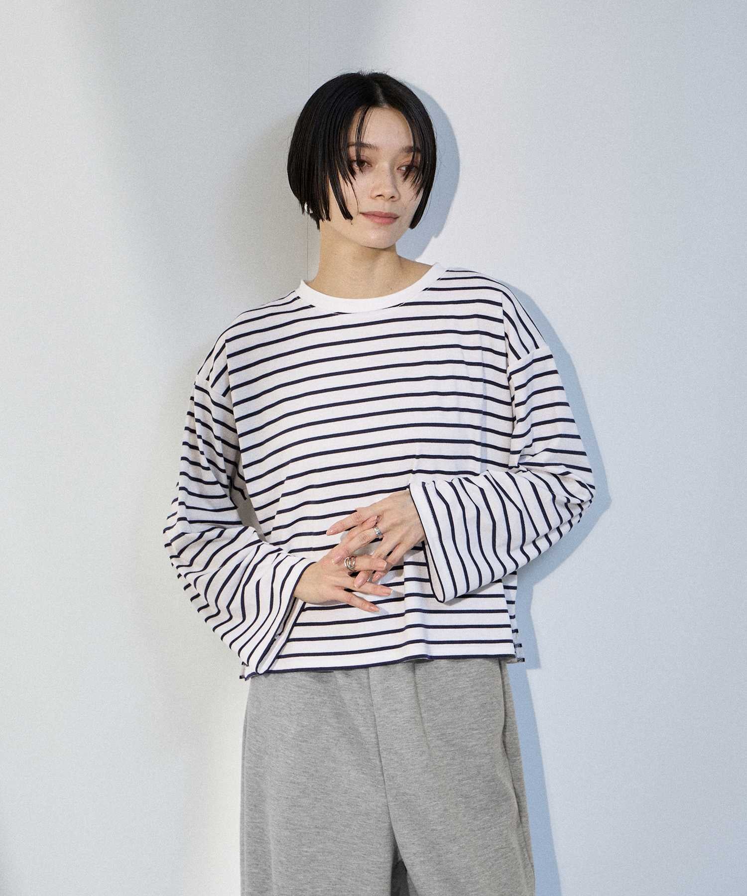 ミリデラール 長袖Tシャツ ロンT ゆったり クロップド丈 ボーダー 白 クルーネック カットソー