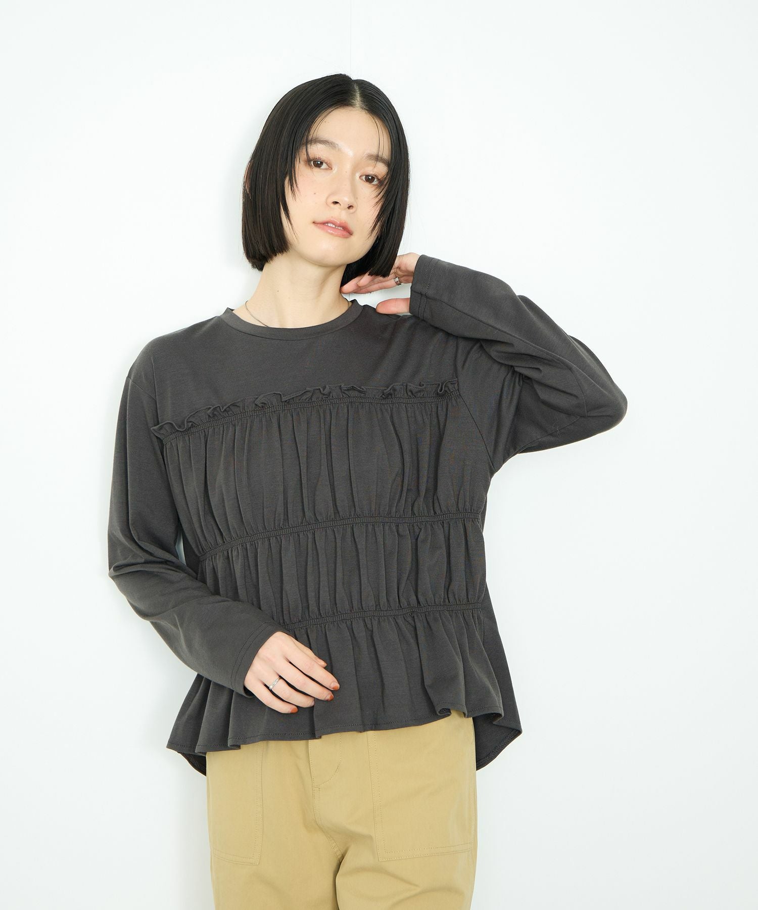 フロントに大胆に施したシャーリングが存在感を放ち、トレンド感のあるデザインカットソー。