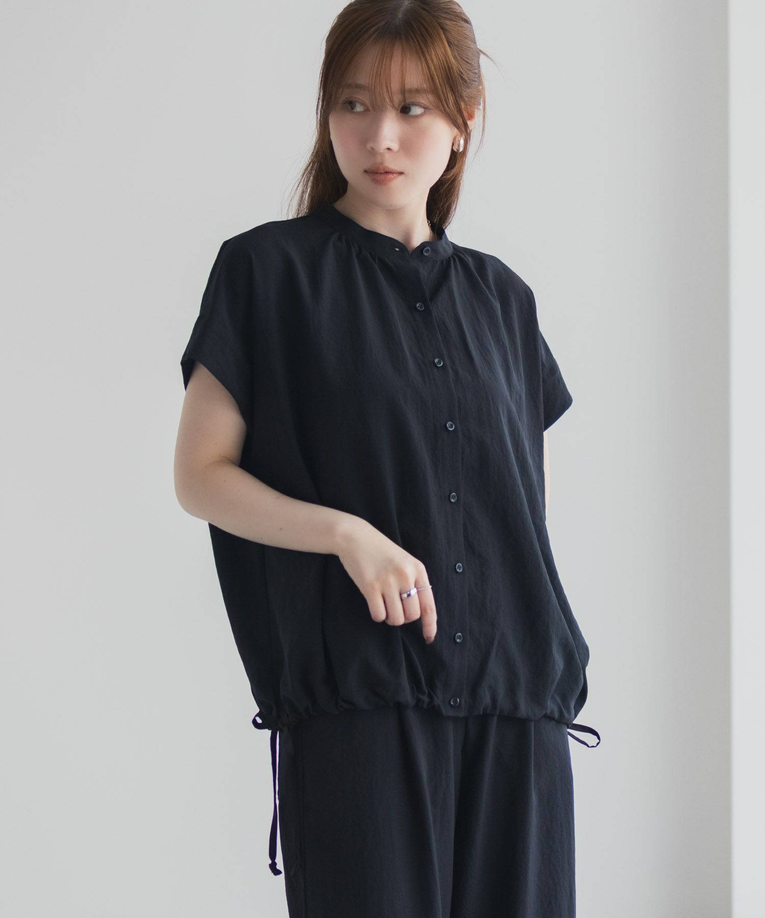 ハッシュアッシュ ブラウス 半袖シャツ 裾スピンドル 紐 リボン シルエット調整可能 無地 黒 バンドカラー カジュアルシャツ