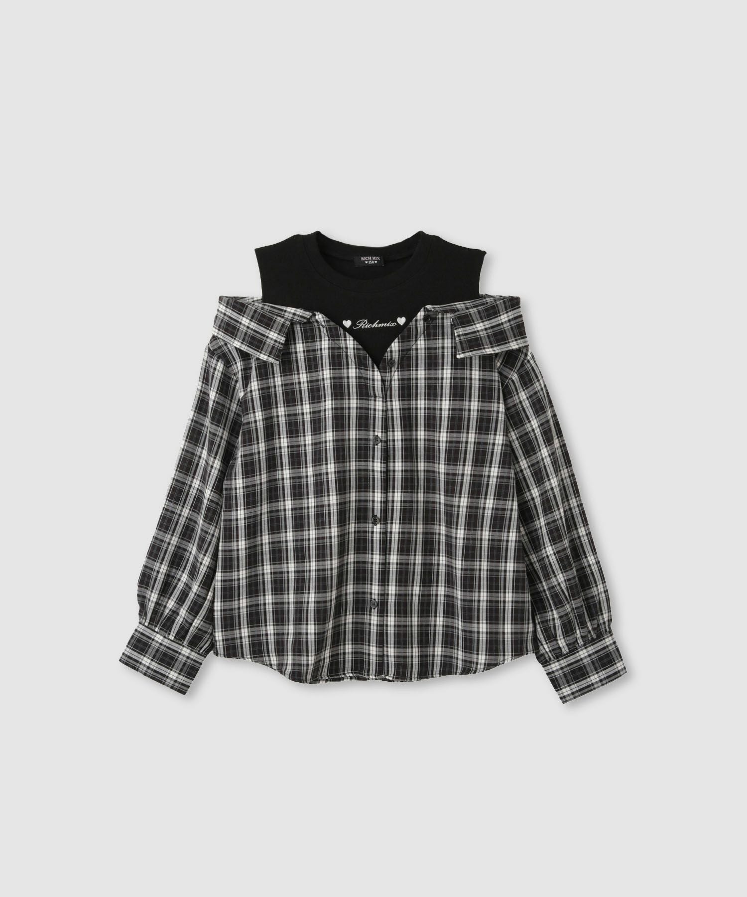 リッチミックス シャツ 長袖 タンクトップ フェイクレイヤード 子供服 女の子 ガールズ チェック デニム ロゴ 刺繍 黒 カジュアルシャツ