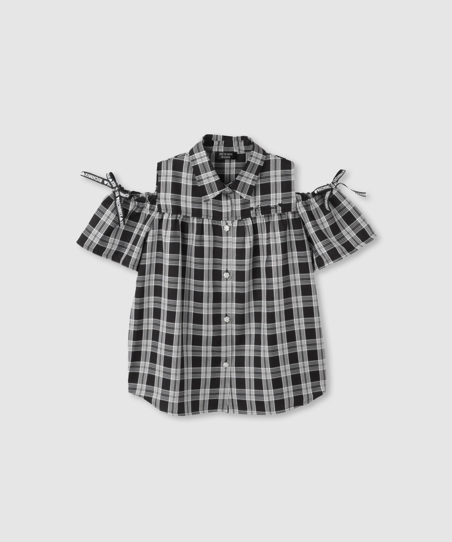 トレンドの肩あきデザインにロゴリボンを添えた、夏映え間違いなしの主役級ブラウス。