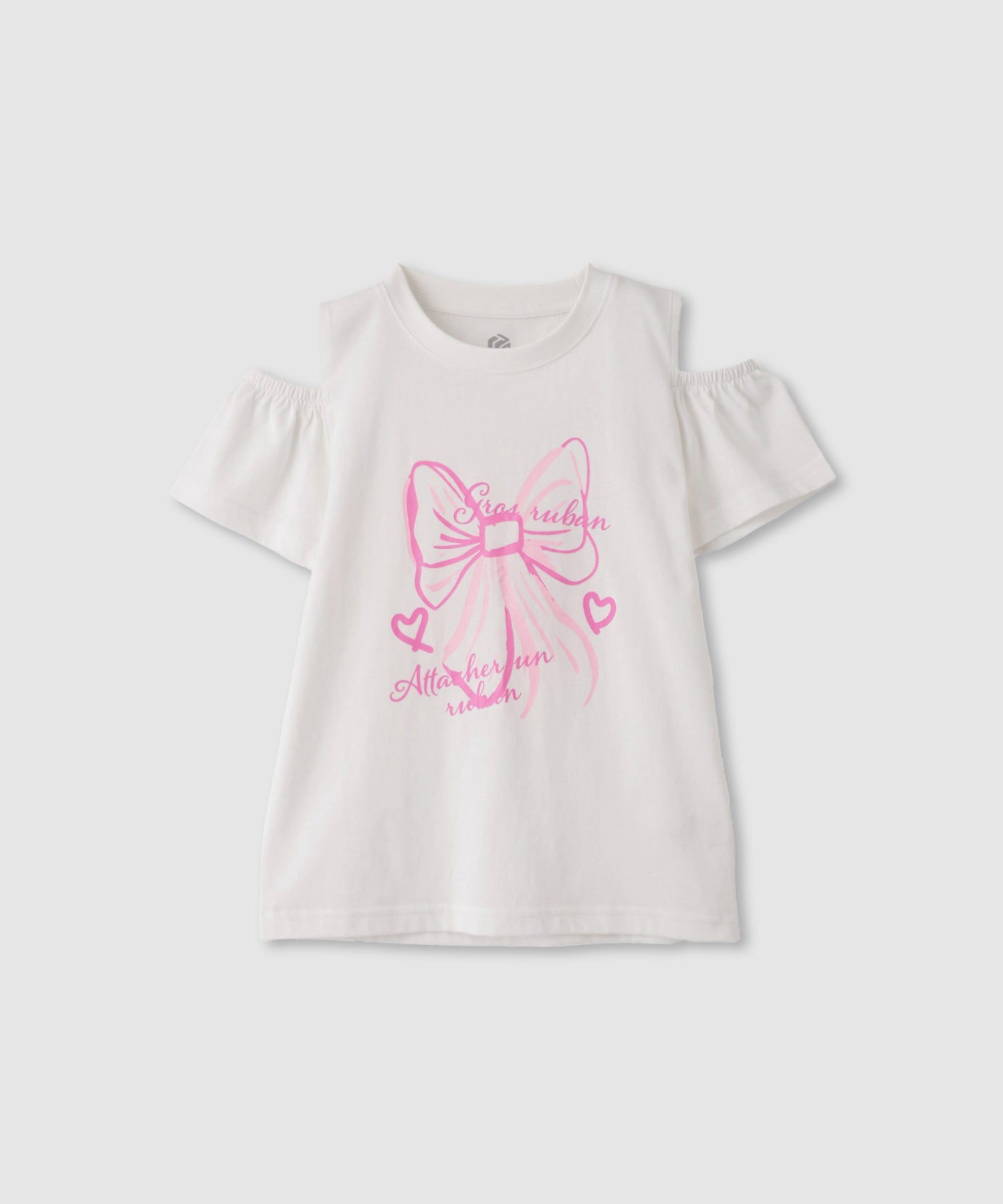 キュートなリボンプリントが目を引く、肩あきデザインのガールズTシャツです。