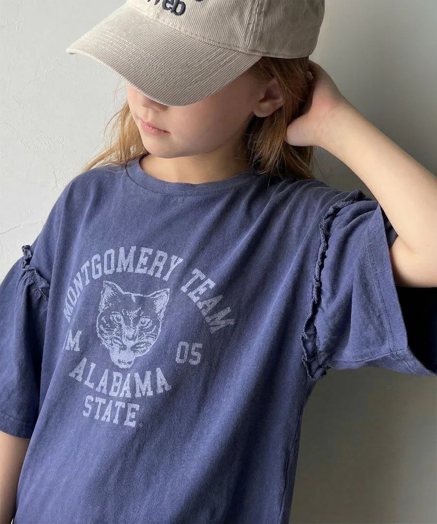 袖のフリルと古着風のカレッジプリントが魅力のキッズTEE。
