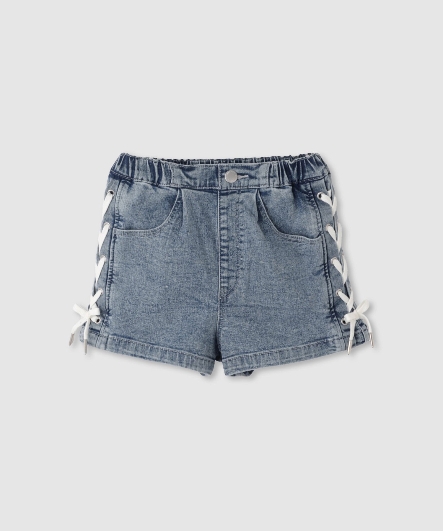 サイドの編み上げがアクセントの、とびきりキュートなデニムショートパンツ。