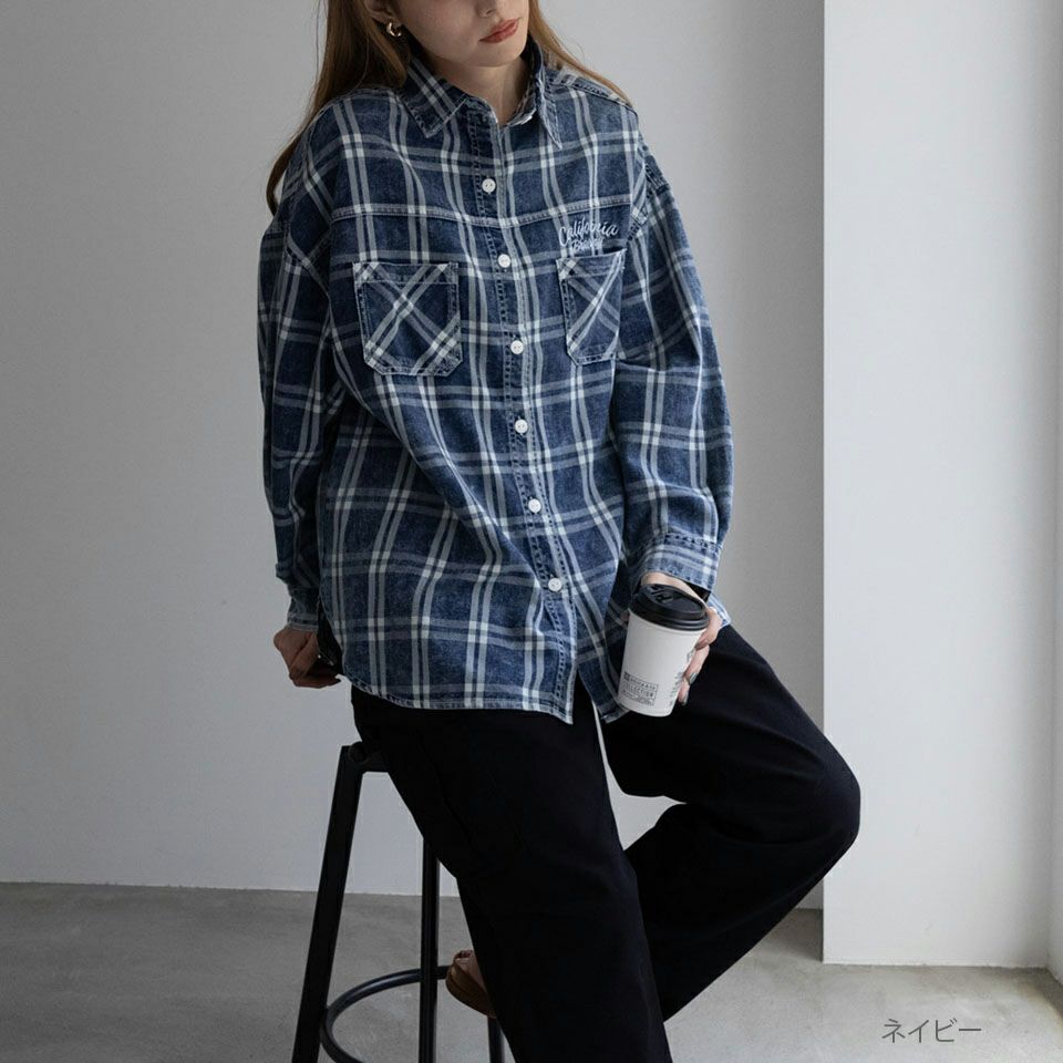 チェック柄で両胸ポケットが付いたデザインに、加工感が楽しめる生地とバックに入った刺繍がポイント。