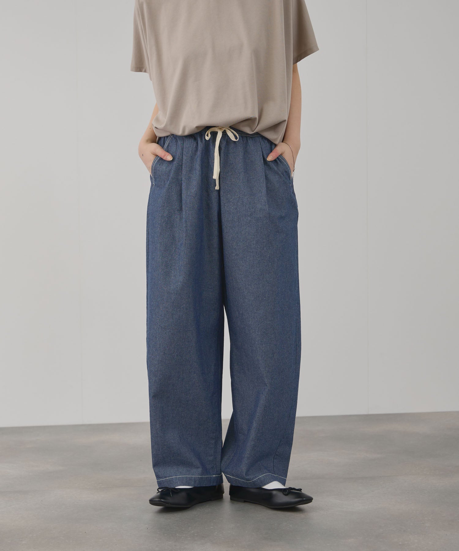 ネイビー デニムパンツ カーブパンツ シャンブレー生地 ライトオンス ゆったり ウエストゴム 紐 ポケット ジーンズ ジーパン ロングパンツ