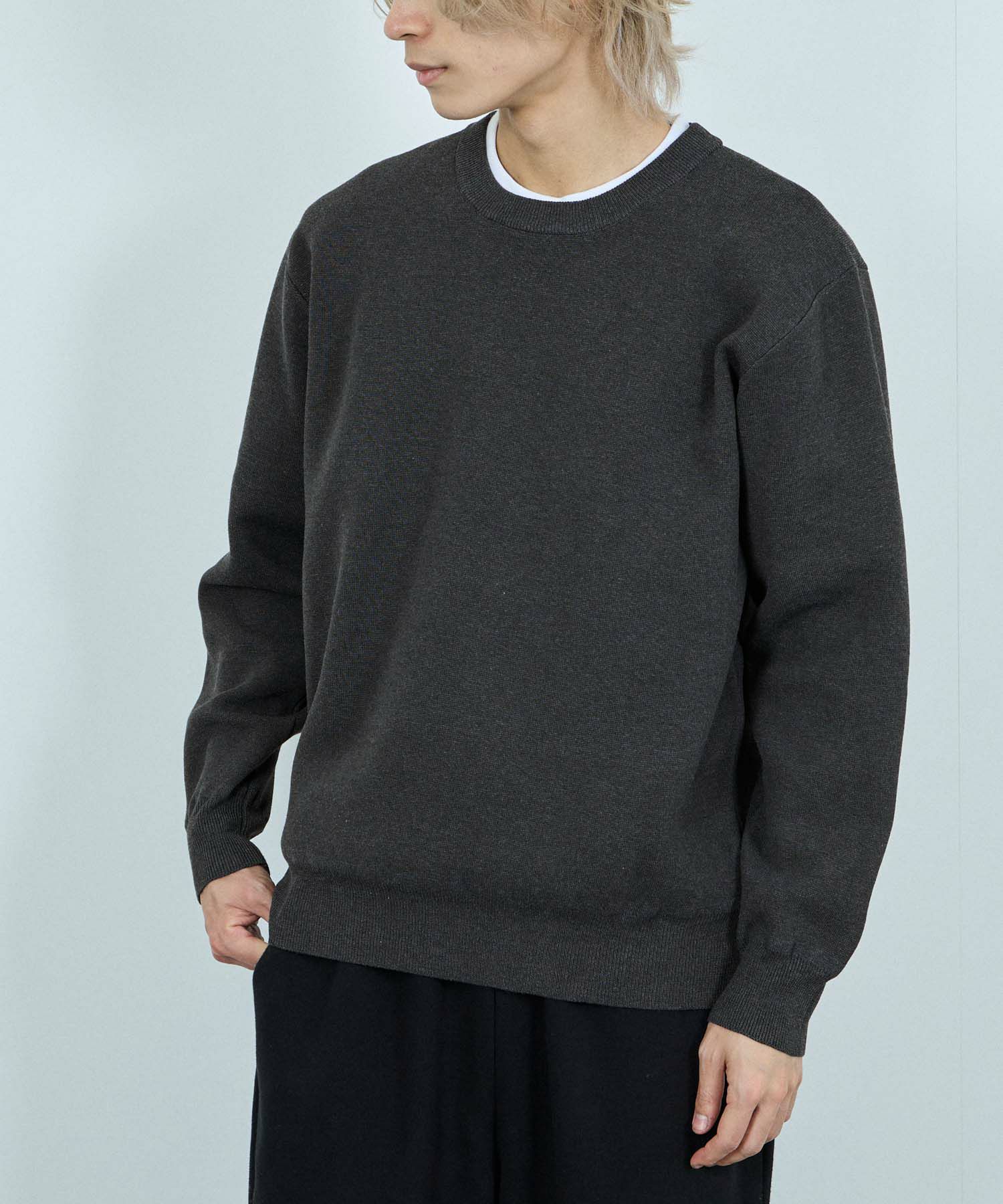 柔らかなふくらみ感とストレッチ性が魅力の、スウェットのように快適な着心地のクルーネックニット。