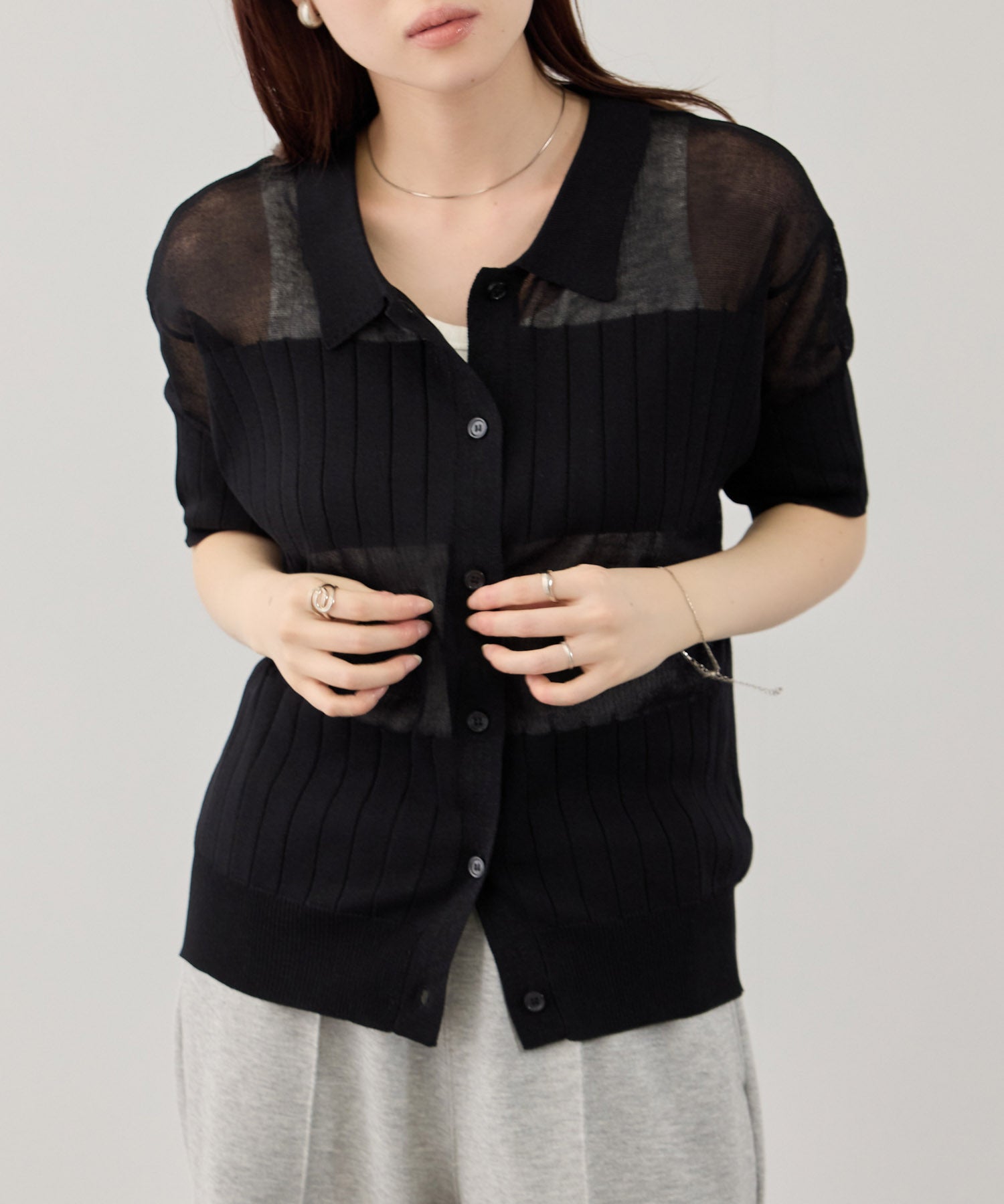 トレンドの襟付きデザインとシアーな質感が、旬の抜け感スタイルを叶えるニットカーディガン。