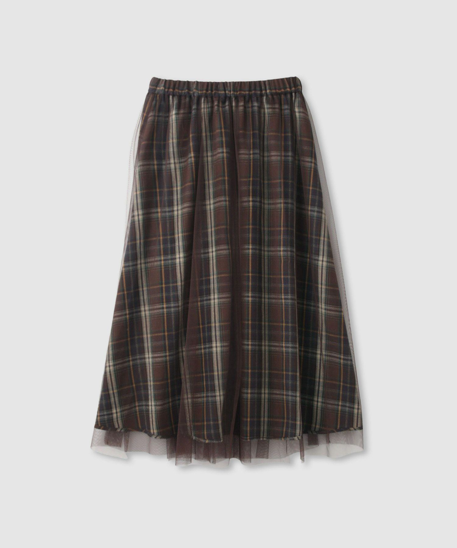 ネルチェック素材にチュールを重ねた、シーズンムードたっぷりのミディスカート。