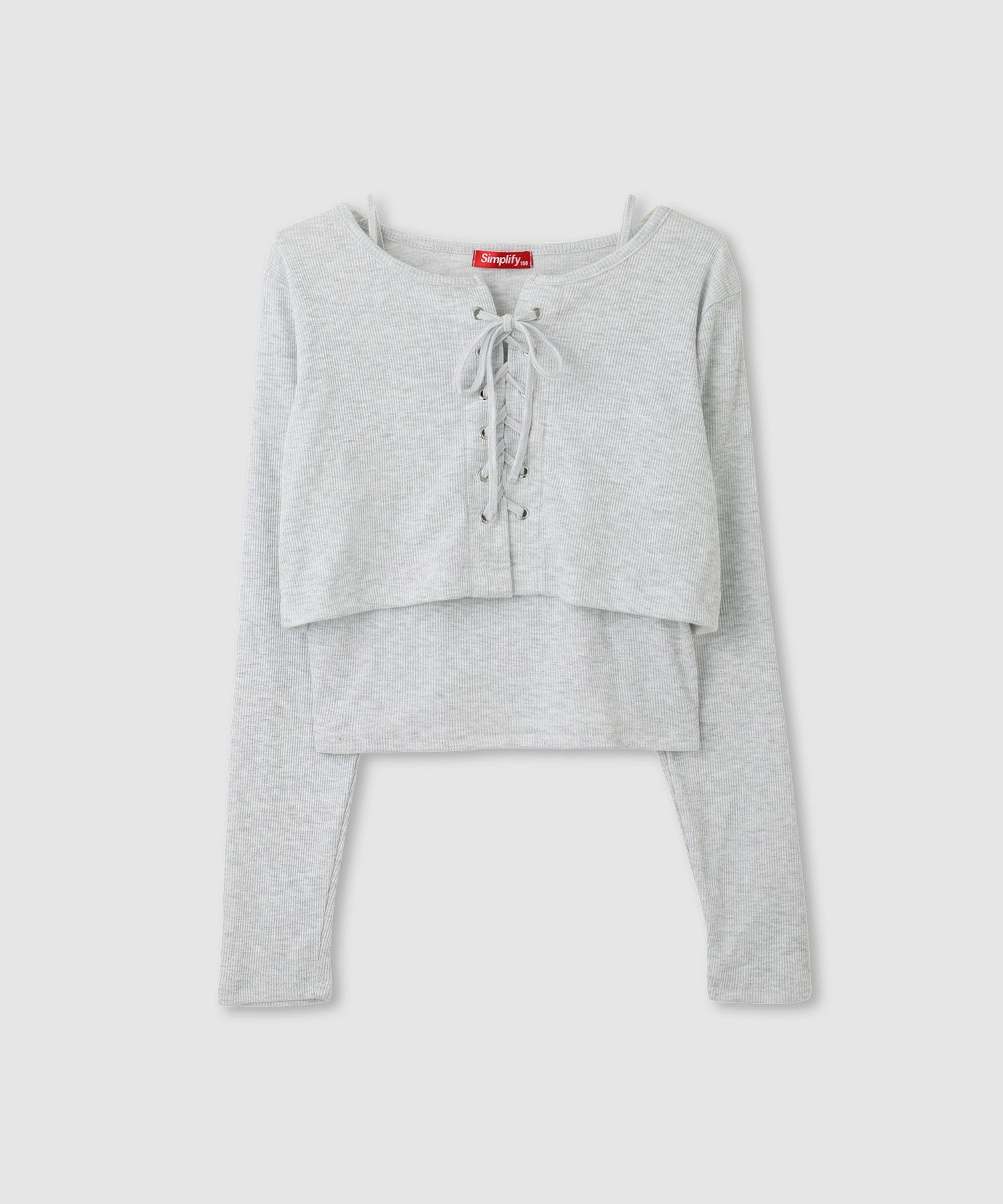 レースアップがかわいいリブ素材のコンパクトなプルオーバーとキャミソールのセットアイテム。